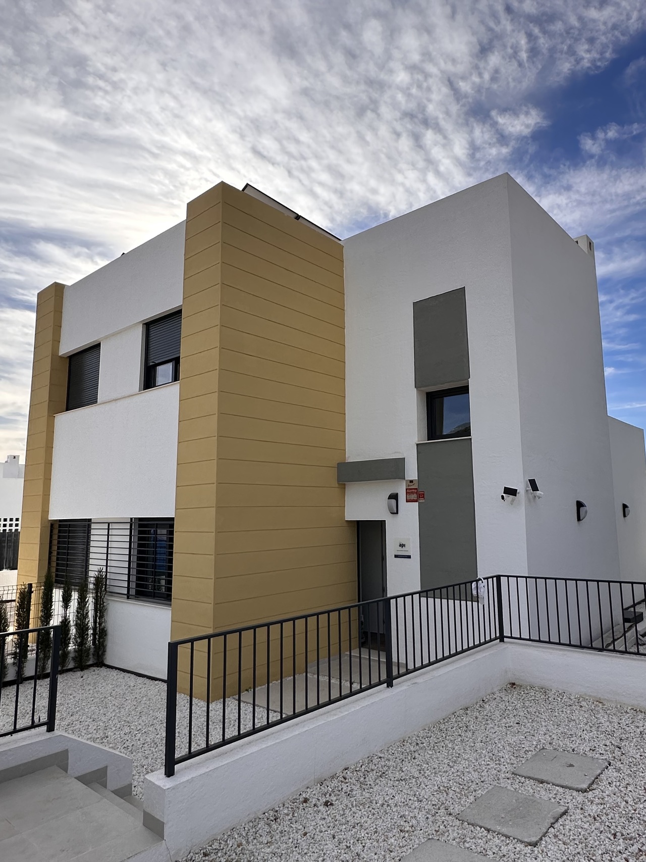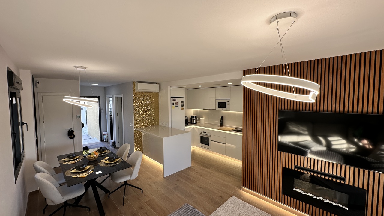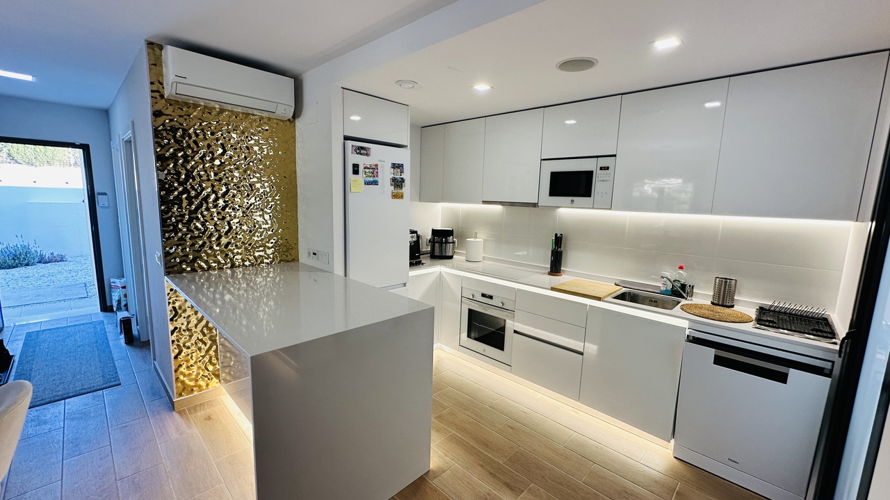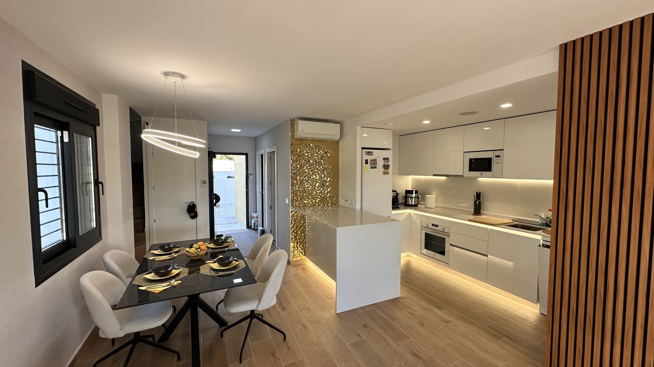 3 bedroom house with garden and private parking on the same plot. Communal pool and green areas. FOR SALE elegant semi-detached house with garden and private parking on the same plot. Communal pool and green areas. In a very quiet area, in a picturesque town of Busot. • 3 bedrooms • 2 bathrooms • Garden • Two terraces • Wonderful views of the mountains This fantastic property consists of: Ground floor (garden level): First guest bedroom with en-suite bathroom or HomeOffice. A pleasant living room - dining room with an open-plan kitchen, fully furnished and equipped with high-end appliances such as TEKA, BALAY, HAIER designed by a professional designer and an artificial LED lighting network. All appliances are new with a two-year warranty. In the middle, there is an island with drawers which expand the kitchen storage area on the inside, among the appliances, oven, dishwasher, all in the same style and color line, in white. Behind the kitchen there is a small gallery with a laundry room and a large living room with a front wall made of artificial wood panels, a 50-inch Q-LED television, a beige leather sofa and its own exit to the terrace area where you can relax, enjoy any meal in the fresh air, pick your own fruit such as lemons for example and all this with beautiful views of the mountains. The garden area has a table, chairs and hammocks to relax. On the First Floor: There are 2 bedrooms and 1 bathroom. The master bedroom has a double bed of 160 x 200 and has its en-suite bathroom. From this bedroom there is access to the solar-type terrace, where you can sunbathe throughout the season, with fantastic views of the mountains. At night you can see an impressive panorama of the town of Muchamiel and the entire area of the province of Alicante Second bedroom with two single beds and an outdoor bathroom. Throughout the house there are radios installed with speakers on the ceilings operating via WI FI and regional stations. Don't miss this opportunity! Visit this spectacular house with a view of the mountains. Schedule an appointment today and experience your new home in Busot!