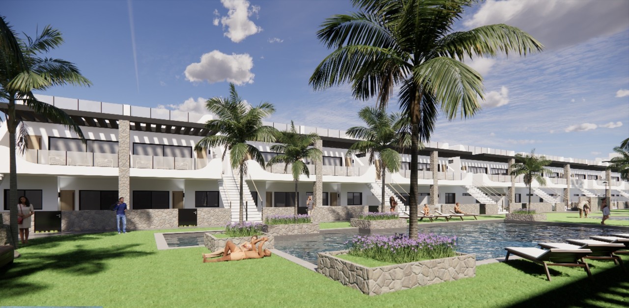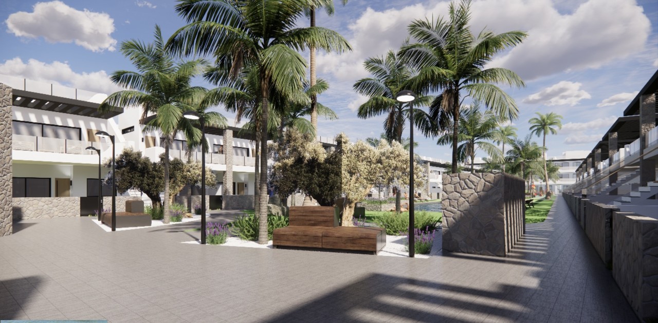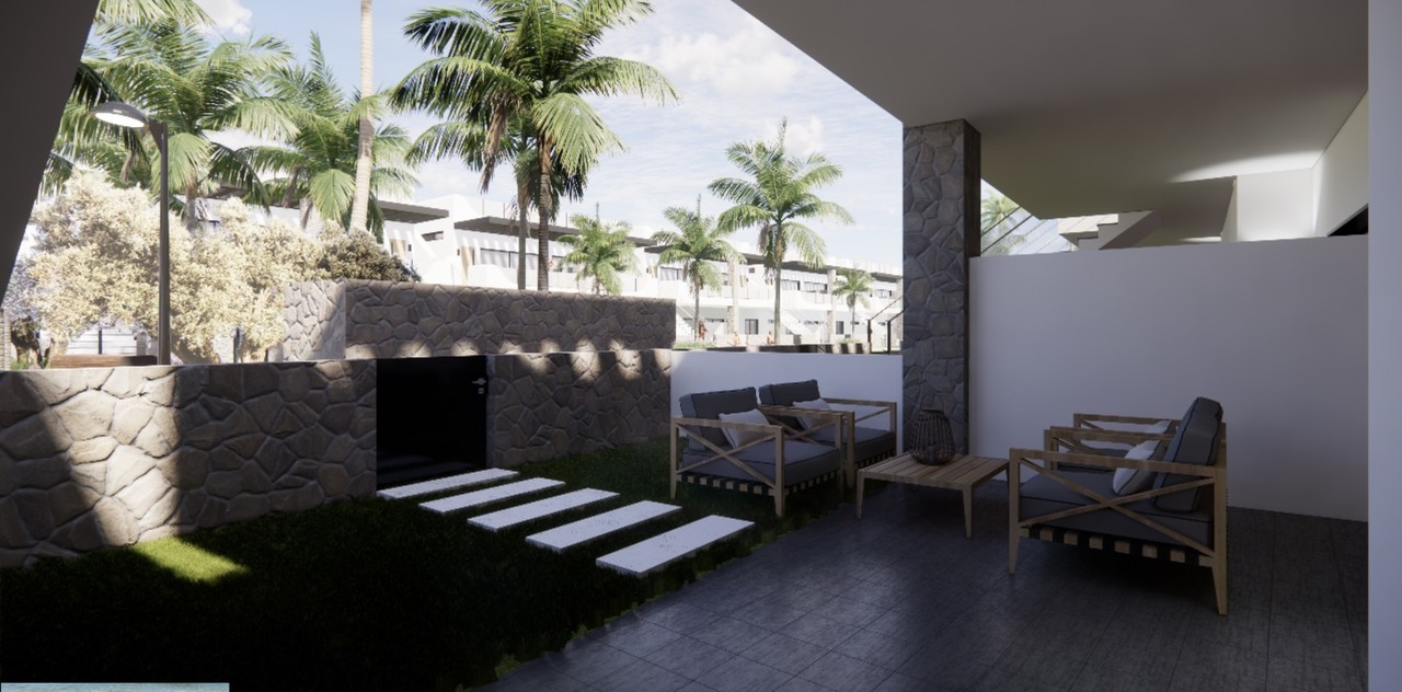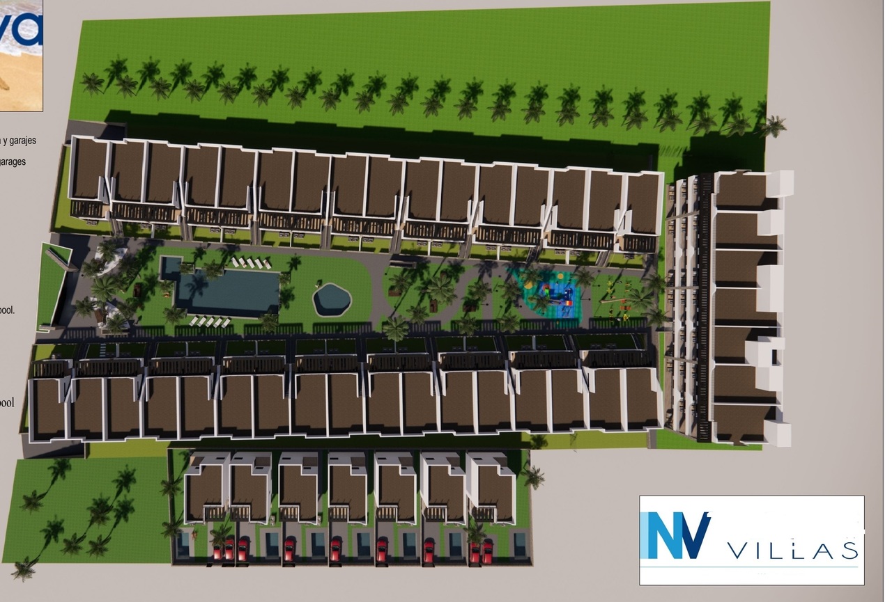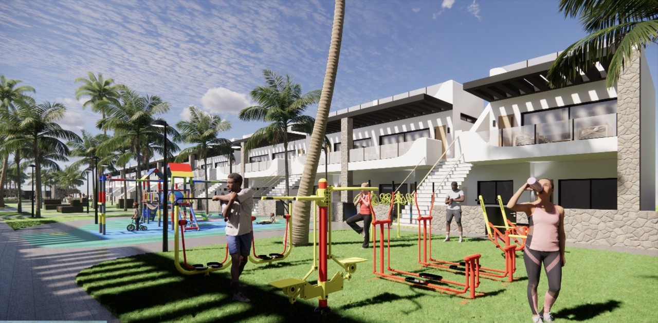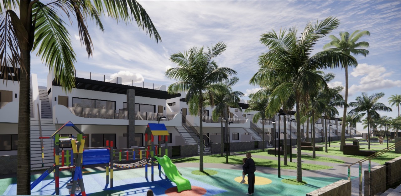FANTASTIC PROJECT CONSISTS OF BUNGALOWS AND DETACHED VILLAS IN DUPLEX STYLE WALIKING DISTANCE TO THE BEACH AND AMENITIES. Only 5 detached Villas are still available and are distributed over two floors, plus the sunny roof terrace. On the ground floor there is a bright and spacious living room, American kitchen, one bedroom with fitted wardrobe and one bathroom. Top floor you consists of three bedrooms with fitted wardrobes and two bathrooms. Master bedroom has en-suit bathroom and you can access a cozy balcony with space for terrace furniture. Stairs up you reach the roof terrace where you have plenty of space for sunbeds, terrace furniture or Jacuzzi. The urbanization will offer nice green areas with a playground for children, a gym and two communal pools. Parking spaces are available. In the surroundings you will find a wide range of nice restaurants, cafes, supermarkets, pharmacies and all the amenities you may need. Within a short drive you can reach the center of Torrevieja and its lovely beaches, as well as the popular beaches of the Orihuela Costa. Villamartin golf course can be reached within a few minutes' drive.