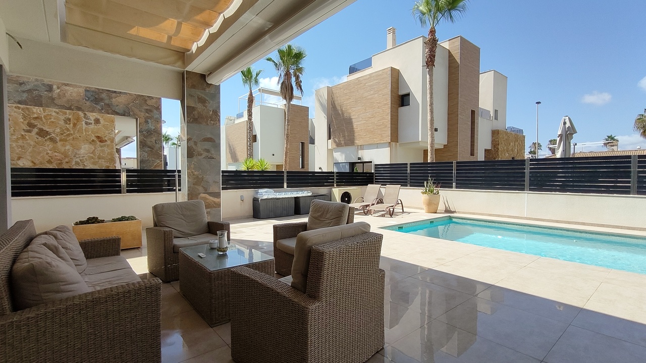 Exclusive South-Facing Villa Near La Mata Beach – Prime Location & Stunning Sea Views Discover this magnificent luxury villa, built in 2018, in one of the most sought-after areas of the southern Costa Blanca. Ideally positioned just a 5-minute walk from La Mata Beach, this stunning home offers a prime coastal location, breathtaking sea views, and sun all day thanks to its perfect south-facing orientation. Situated within the prestigious El Amanecer I Villas complex, this property is surrounded by pristine beaches, beautiful coastal landscapes, fine dining restaurants, charming cafés, and all essential amenities—ensuring a relaxed and vibrant Mediterranean lifestyle. This spacious villa features 3 elegantly designed bedrooms with fitted wardrobes and 3 modern bathrooms. The bright open-plan living area seamlessly connects to a stylish fully equipped kitchen, while large windows flood the space with natural light, enhancing the home’s warm and inviting atmosphere. Step onto the covered terrace, where you can unwind while overlooking your heated private pool, surrounded by a lush, beautifully landscaped garden—your own piece of paradise. The upper level offers access to a large terrace from both bedrooms (both with en-suit bathrooms), leading to the expansive rooftop solarium. From here, enjoy unparalleled panoramic sea views, complemented by a BBQ area and outdoor dining space—ideal for relaxing or entertaining while soaking in the Mediterranean breeze. Designed for maximum comfort and luxury, this villa is equipped with high-tech appliances, ducted air conditioning (hot & cold), underfloor heating, electric shutters & awnings, and a state-of-the-art alarm system. It also features private covered parking within a secure gated community with access to two streets.