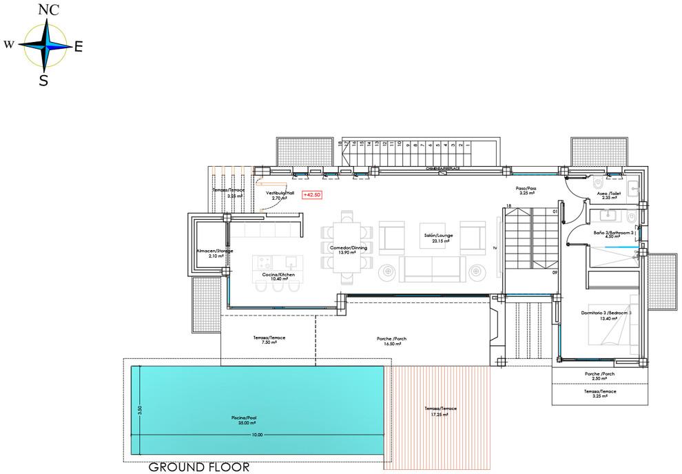 WELCOME TO THE BRAND NEW PROMOTION OF 3 LUXURY MODERN VILLAS BORDERING THE NATURE IN MONTE BIARRITZ, NUEVA ATALAYA, ESTEPONA! PLEASE, DISCOVER VILLA DUNAS! Many of the new clients who discover Costa Del Sol will be looking for a peaceful, private and family oriented property location, which at the same time will be close to nature and yet within minutes drive from shops, schools, restaurants and other amenities. The area of Monte Biarritz offers excellent connections to Benahavis, San Pedro Alcántara, Estepona, Puerto Banús and Marbella town within a fifteen-minute radius. Our project of 3 new quality modern villas is the perfect choice for these newcomers due to its quiet location on a cul-de sac street, its spacious and well organized open-plan living space, its 4 perfectly fitted en-suite bedrooms (1 of the bedrooms in the lower basement level) and its cozy private garden/pool area… All this, just on the edge of the natural world! All this, just five minutes drive from the beach, shopping centres, restaurants, schools and golf courses! THE DESIGN: The villas offer a modern choice of architectural design with a lot of natural light solutions, which perfectly fits them within the permanently modernizing neighbourhood and the green environment. THE QUALITIES: The interior spaces have been attentively planned to offer comfort and quality to the new home owners. The main focus was made on the use of the well known innovative design, high tech features and unbeatable quality of “Porcelanosa” materials, which is today a major reference in both the Spanish and the International market. THE APPLIANCES: Not only do “Bosch” appliances fit seamlessly with any kitchen but the performance and reliability of its high-quality products also perfectly complement its users daily routines. We chose “Bosch” for its features and functions, which make every day easier and more enjoyable. THE COMFORT: Although we have one of the world's best climates, winters can also get sometimes a little chilly. Our villas offer an under floor heating solution throughout the ground floor and the first floor level, which creates an effortless cozy barefoot winter feeling and undeniable modern luxury extra to the new style home. THE PARKING: Because the car is one of the most prized possessions of any family, it is a great investment to keep it safe. Therefore, we chose to install a carport for 2 cars as a parking solution. We consider that a carport can be at the same time beautiful and unobtrusive addition to the property. VILLA DUNAS: On the ground floor we find: an open plan living, dining and kitchen space with outdoor terraces, a small storage room, a guest bathroom and the guest en-suite bedroom with its private terrace. The first floor is distributed in a Master bedroom en-suite with it spacious private terrace and the second guest bedroom with its own bathroom and a balcony. The roof floor offers a spacious solarium area with a pre-installation of a built-in Jacuzzi. There are some partial sea views from this level. The basement level in these villas presents a third guest bedroom with a small natural light window, a gym and cinema room space, and a storage room. There is a private pool, garden and the carport for 2 cars.