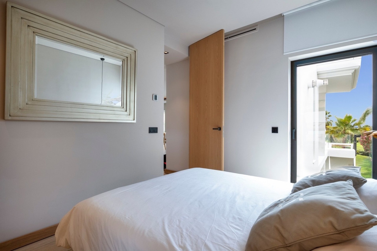 A truly stunning modern villa, frontline to Los Naranjos Golf course in the heart of Nueva Andalucía. This beautiful family home boasts 6 bedrooms all with bathrooms en-suite. Built over 3 levels, this property offers 2 fully fitted kitchens, 2 living rooms and 2 dining areas, rarely seen in Marbellas luxury villas as has on both the ground swimming pool level and on the first floor (main living level) enjoying wonderful views over the golf. Quality finishes and appliances throughout, with Bulthaup Kithcen, underfloor heating in addition to hot and cold air conditioning, wooden flooring and private elevator (lift). Set on a good sized plot of 1.430m2, with an immaculately kept garden, boasting a stylish heated outdoor swimming pool. The property includes a carport for 3 cars plus additional parking for 2 further cars. Surrounded by golf, this property is well located and close to amenities and facilities whilst being only a few minutes’ drive to the marina of Puerto Banus, Marbella and San Pedro towns as well as easy access to the highway in both directions.