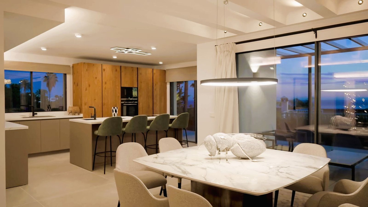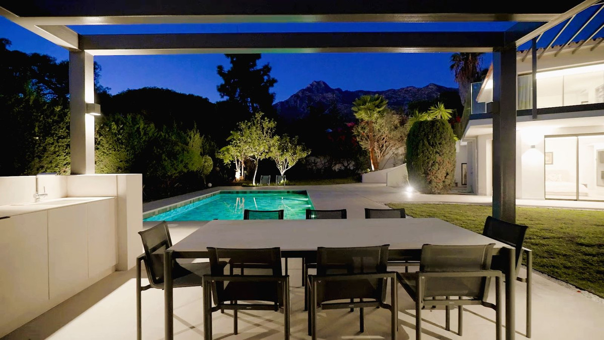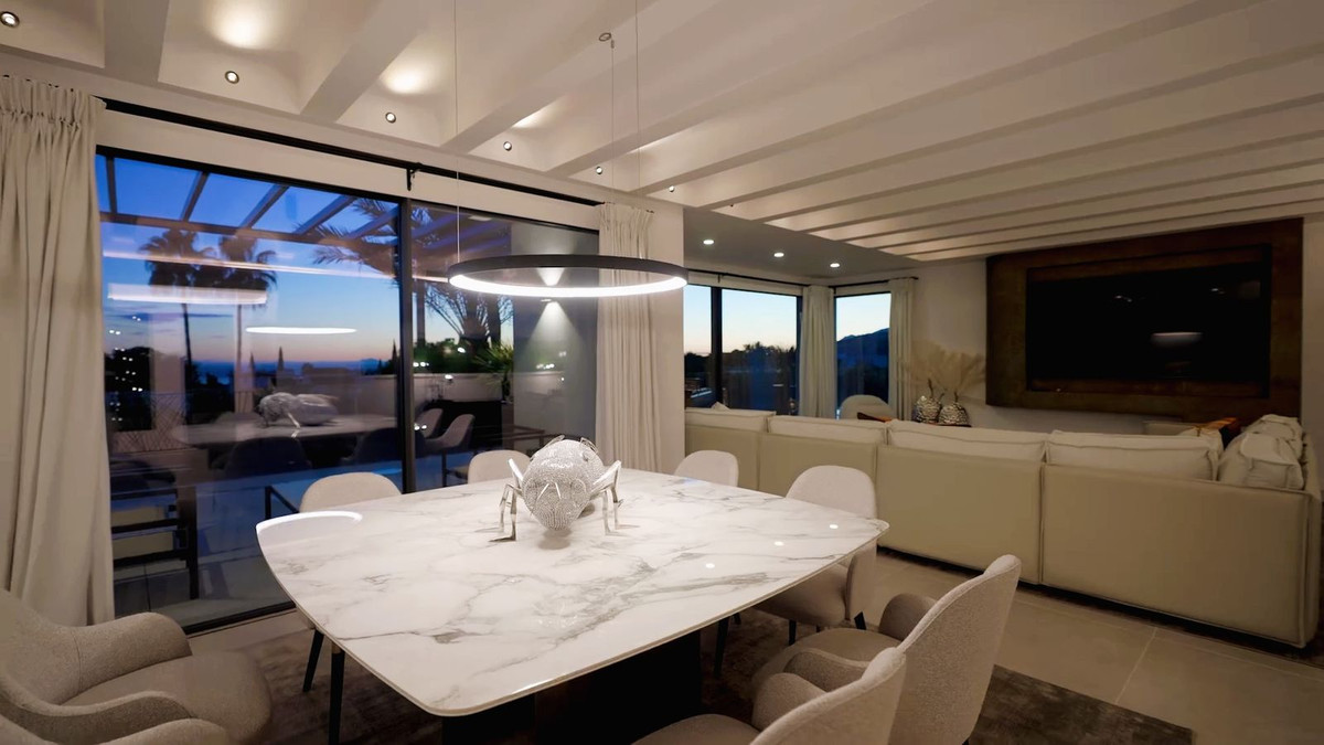 Fully renovated luxury villa, located on the Golden Mile, with panoramic views of the Mediterranean and La Concha, and the convenience of being within walking distance of the centre of Marbella and Swans International School. The property was redeveloped, by a company with over 20 years experience in Marbella, featuring a high end luxury interior, complete with the latest technology. Featuring a spacious, enclosed living area of 405m2 full of natural light, featuring a sizeable living area with a feature fire place, luxury kitchen with high end appliances, dining area, 5 bedrooms and 5 bathrooms plus a guest toilet. With incredible panoramic sea views from the living area, master bedroom and 179m2 roof top solarium Outside you have over 700m2 of covered and uncovered terraces, all set within a mature garden, with a private swimming pool, and covered parking for up to 3 cars. Located in a quiet location with the reassurance of overnight security patrols. Main features include, Underfloor heating and central air-conditioning with air-zone control system. New bathrooms through out with high quality fitting. High quality kitchen and fully fitted laundry room Interior gas fire place Pre-installation for solar and Photovoltaic Terrace living area with luxury glass balustrade and metal pergola covering the entire area. The urbanization has night time security patrols, for enhanced security.