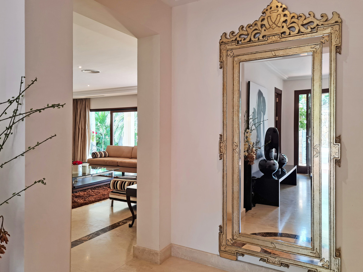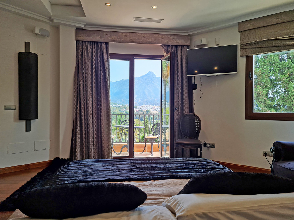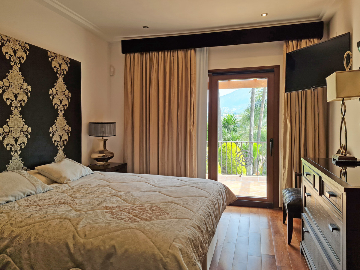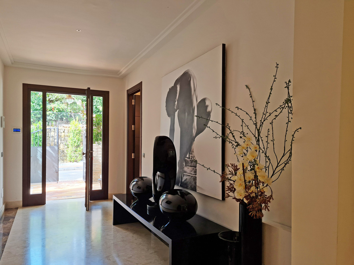 Deze prachtige villa, gelegen in een rustige doodlopende straat, biedt uitzonderlijke privacy en een adembenemend uitzicht over de golfvallei richting de berg La Concha. Gebouwd volgens de hoogste normen, beslaat de villa drie verdiepingen met een elegant interieur en een naadloze overgang tussen binnen en buiten. De begane grond beschikt over een ruime woonkamer met uitzicht op de tuin en de bergen, een stijlvolle eetruimte en een open keuken, die allemaal uitkomen op een groot terras, perfect om buiten te eten. Deze verdieping beschikt ook over drie prachtig ontworpen slaapkamers met eigen badkamer en kleedruimte. Boven vindt u de luxe master suite met een eigen badkamer en kleedruimte. De benedenverdieping biedt twee extra slaapkamers en een entertainmentruimte met thuisbioscoop. Buiten is de weelderige tuin een privéoase met een prachtig zwembad met zonneterras en volop ruimte om te ontspannen. Dit uitzonderlijke huis ligt in een van de meest gewilde gebieden van Nueva Andalucía en combineert privacy, elegantie en de nabijheid van de beste voorzieningen van Marbella.