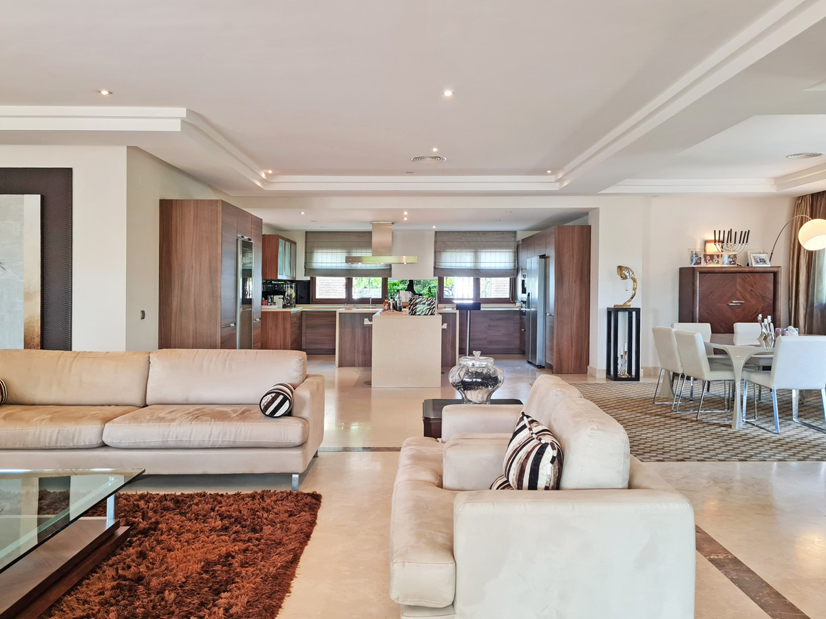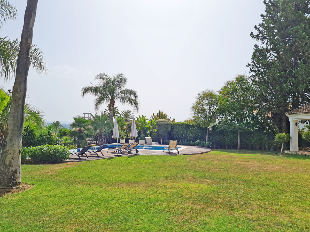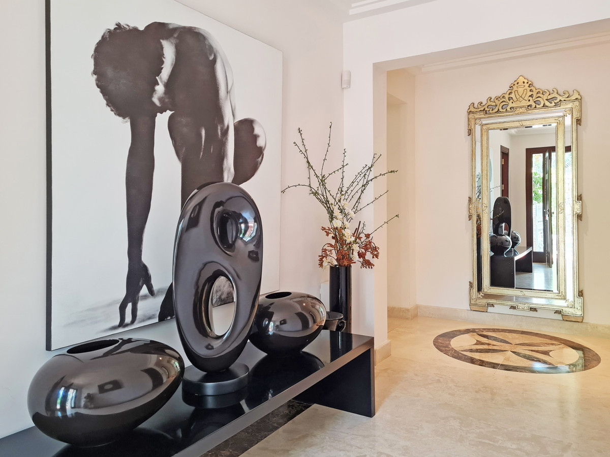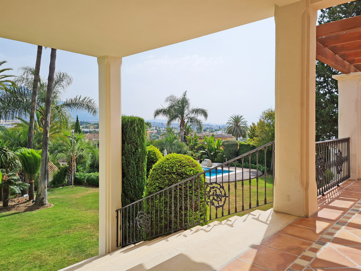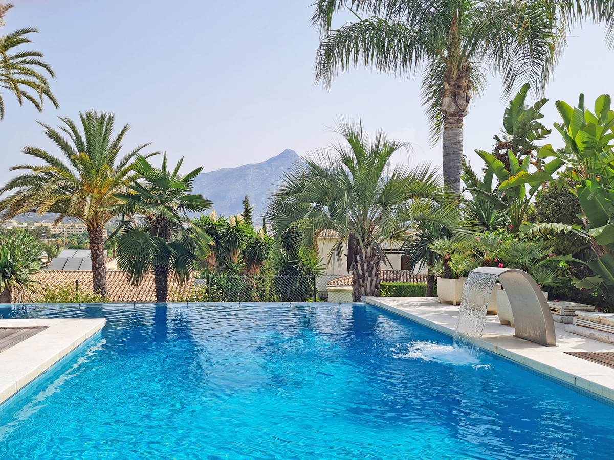Deze prachtige villa, gelegen in een rustige doodlopende straat, biedt uitzonderlijke privacy en een adembenemend uitzicht over de golfvallei richting de berg La Concha. Gebouwd volgens de hoogste normen, beslaat de villa drie verdiepingen met een elegant interieur en een naadloze overgang tussen binnen en buiten. De begane grond beschikt over een ruime woonkamer met uitzicht op de tuin en de bergen, een stijlvolle eetruimte en een open keuken, die allemaal uitkomen op een groot terras, perfect om buiten te eten. Deze verdieping beschikt ook over drie prachtig ontworpen slaapkamers met eigen badkamer en kleedruimte. Boven vindt u de luxe master suite met een eigen badkamer en kleedruimte. De benedenverdieping biedt twee extra slaapkamers en een entertainmentruimte met thuisbioscoop. Buiten is de weelderige tuin een privéoase met een prachtig zwembad met zonneterras en volop ruimte om te ontspannen. Dit uitzonderlijke huis ligt in een van de meest gewilde gebieden van Nueva Andalucía en combineert privacy, elegantie en de nabijheid van de beste voorzieningen van Marbella.