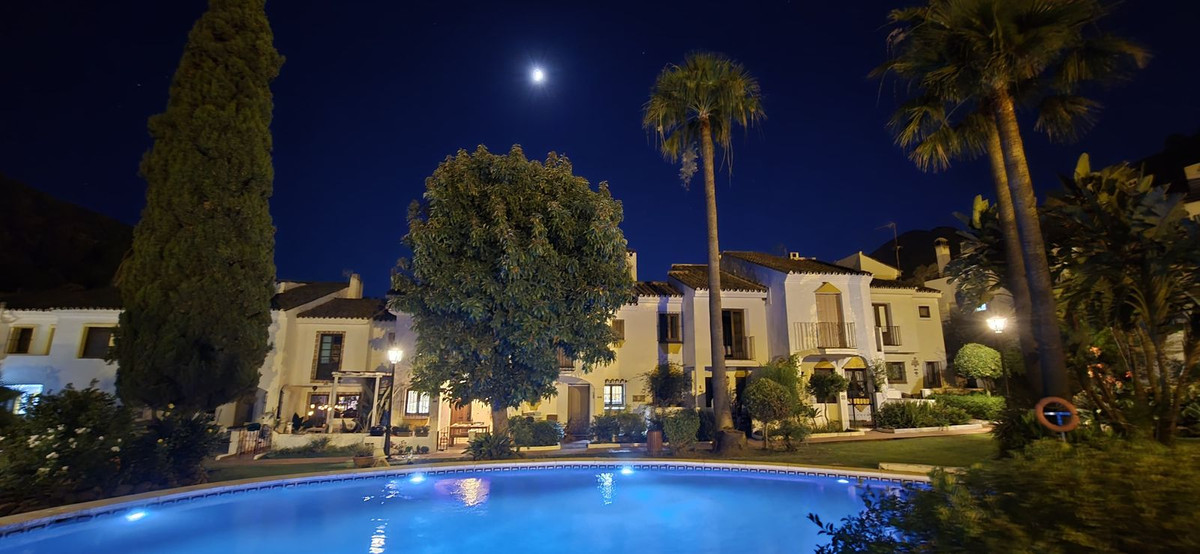 Dit charmante en traditionele Andalusische herenhuis ligt in het dorp Benahavis, op korte loopafstand van het centrum, waar u een ruime keuze aan restaurants, bars en alle andere voorzieningen vindt. Het huis is gelegen in een kleine urbanisatie met prachtige tuinen en een centraal zwembad. Er is ook een privéparkeerplaats voor de bewoners. Het huis zelf is verdeeld over drie verdiepingen. U betreedt de woning via een prachtig terras aan de voorzijde met uitzicht op het zwembad. Op de begane grond bevindt zich een ruime zit-/eetkamer die uitkomt op een patio aan de achterzijde met een citroenboom en kleurrijke planten. De keuken is compact, maar volledig uitgerust en kan indien gewenst worden opengebroken om een open woonruimte te creëren. Er is ook een gastentoilet op deze begane grond. Boven, op de eerste verdieping, bevinden zich drie slaapkamers en twee badkamers. De hoofdslaapkamer heeft een ensuite badkamer, terwijl de andere twee slaapkamers een familiebadkamer delen. Op de bovenste verdieping bevindt zich een solarium met extra bergruimte en een wasruimte. Het huis heeft een traditionele stijl met prachtige houten balken en houten kozijnen. Er is airconditioning in alle kamers en een heerlijke centrale open haard in de woonkamer voor gezellige winteravonden. Dit huis biedt veel ruimte en mogelijkheden voor wie een karaktervol huis zoekt op een gewilde locatie. Het is ideaal voor gezinnen vanwege de fantastische tuin en het zwembad.