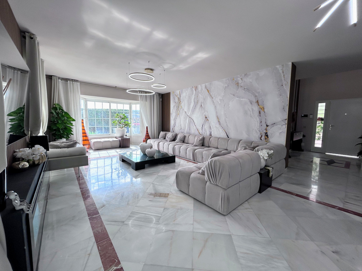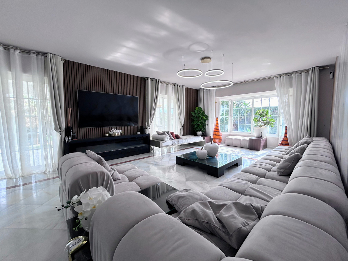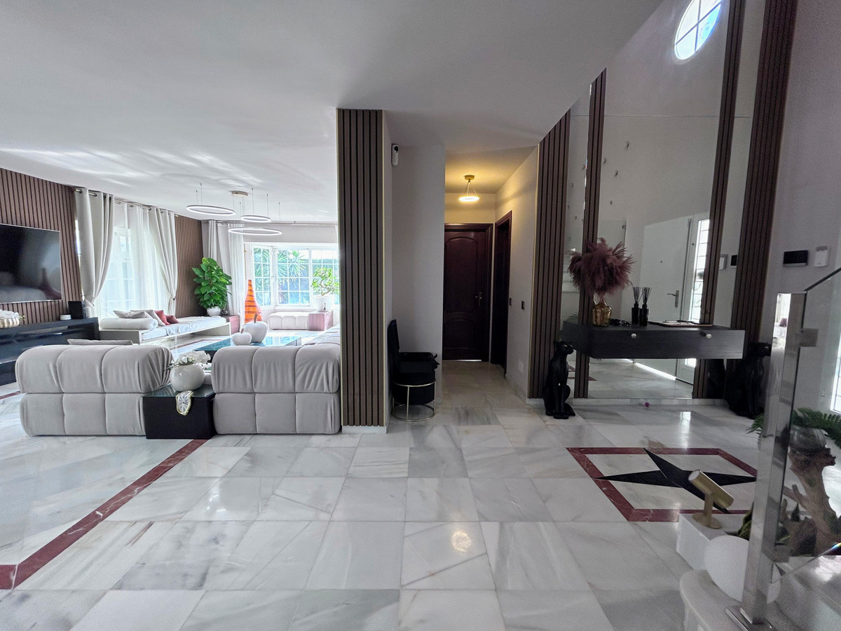 Deze lichte en ruime villa is gelegen in de rustige woonwijk Guadalmina Alta, op slechts 5 minuten van het strand en 8 minuten van het levendige Puerto Banús. De woning is veilig afgesloten en staat op een royaal perceel van 1.400 m² met een bebouwde oppervlakte van 623 m², wat een stijlvolle en comfortabele woonomgeving biedt. De villa, volledig gerenoveerd in 2022, combineert een fris, modern design met royale afmetingen. De belangrijkste woonruimtes zijn licht en uitnodigend, met een volledig uitgeruste moderne keuken die uitkijkt op de eet- en woonkamer, ideaal voor zowel het dagelijks leven als voor gasten. Met 7 slaapkamers en 7 badkamers is de woning perfect geschikt voor grote gezinnen of gasten die op zoek zijn naar privacy en comfort. Het buitenleven staat centraal in deze woning, met een groot privézwembad omgeven door volgroeide tuinen, de perfecte setting om te ontspannen of te genieten van de zonnige levensstijl aan de Costa del Sol. De kelder van 180 m² moet nog worden afgewerkt en biedt eindeloze mogelijkheden om een bioscoop, fitnessruimte, spa of entertainmentruimte naar uw smaak in te richten. Een zeldzame kans om eigenaar te worden van een instapklare villa met extra potentieel in een van de meest gewilde woonwijken van Marbella.