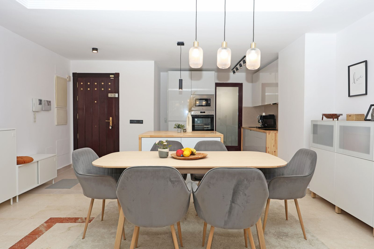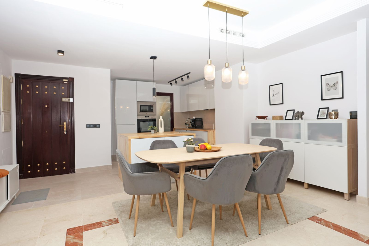 Dit prachtig gemoderniseerde appartement op de begane grond in La Mairena, Marbella, biedt 2 slaapkamers, 2 badkamers en 138 m² lichte woonruimte in een rustige, afgesloten woonwijk midden in de natuur. De open indeling beschikt over een designkeuken, eethoek en een met glas omsloten terras – perfect als tweede woonkamer of thuiskantoor. De privétuin biedt directe toegang tot de aangelegde gemeenschappelijke ruimtes en biedt een prachtig uitzicht op zee en de bergen dankzij de zonnige zuid-zuidwestelijke oriëntatie. Bewoners hebben toegang tot resort-achtige voorzieningen, waaronder panoramische zwembaden, een fitnesscentrum, sauna, tennis- en padelbanen en snelle wifi in de community. Een golfclub is op loopafstand. Ondergrondse parkeergelegenheid en een berging zijn inbegrepen. Op slechts 5 minuten van de Duitse School van Marbella en op 10 minuten van de stranden en restaurants van Elviria.