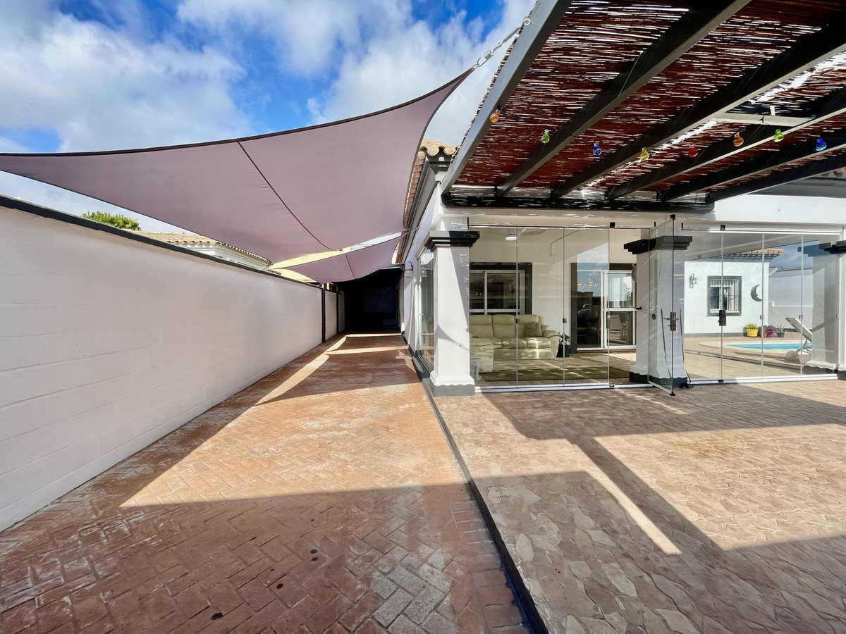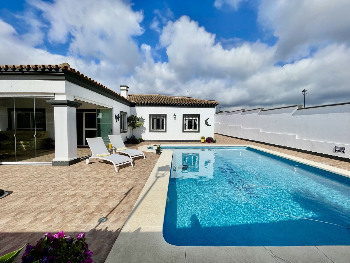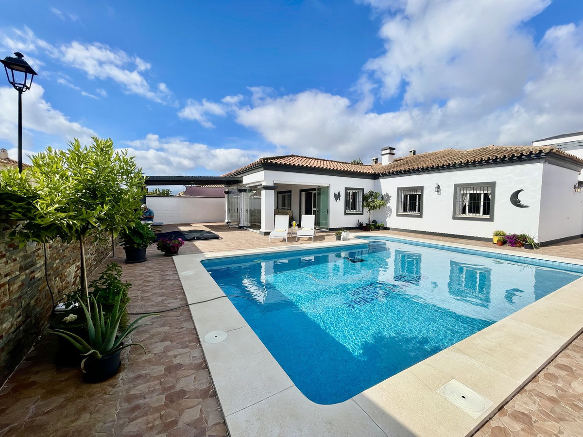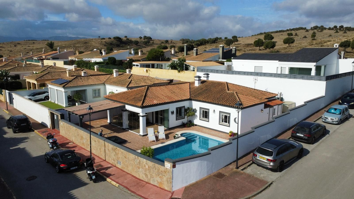 Deze charmante gelijkvloerse villa met 4 slaapkamers en 3 badkamers in Los Barrios biedt comfort, privacy en moderne afwerkingen in een rustige woonwijk. Gelegen op een hoekperceel van 495 m² met een bebouwde oppervlakte van 229 m², biedt de woning een open uitzicht over het groene landschap, Gibraltar en uitstekende privacy. De villa, oorspronkelijk gebouwd in 2004, is dit jaar (2025) grondig gerenoveerd. Er is meer dan € 50.000 geïnvesteerd in verbeteringen, waaronder een nieuwe keuken, overal tegelwerk, een groot terras met glazen wanden en een volledige herschildering van zowel de binnen- als buitenkant. Het resultaat is een frisse, instapklare woning die een moderne stijl combineert met een ontspannen mediterrane levensstijl. De woning is met veel aandacht voor detail en zorg gerenoveerd voor eigen gebruik. De woning is gelijkvloers en beschikt over vier slaapkamers, een lichte en ruime woonkamer met toegang tot het terras met toegang tot een groot privézwembad van 40 m² en een aparte verwarmde spa van 5 m². Het zwembadgedeelte is volledig betegeld en versierd met potplanten, wat zorgt voor een groene sfeer en tegelijkertijd het onderhoud eenvoudig houdt. Er is ook een garage/oprit met ruime bergruimte en parkeergelegenheid op eigen terrein voor drie auto's. Er zijn drie slaapkamers die twee complete badkamers delen, allemaal met inbouwkasten. De hoofdslaapkamer is goed geproportioneerd met een grote kleedruimte en een eigen badkamer. Elke slaapkamer is voorzien van airconditioning of een plafondventilator als u de voorkeur geeft aan een energiezuinigere optie. De keuken is volledig uitgerust en buiten bevinden zich een bijkeuken en een voorraadkast. Aan de achterkant van het huis bevinden zich drie opbergruimtes, ideaal voor het opbergen van bagage, extra meubels en apparatuur. Er ligt een uitgestrekt nationaal park direct naast het huis en twee stadsparken op respectievelijk 2 en 5 minuten loopafstand, ideaal voor gezinnen en ochtendwandelingen. Het nabijgelegen Palmones-estuarium, een beschermd natuurreservaat, ligt op slechts 5 minuten rijden en is een geliefde plek voor hondenbezitters en natuurliefhebbers. De villa ligt op loopafstand van winkels, cafés, dierenartsen en lokale voorzieningen en op korte loopafstand van Palmones, een charmant vissersdorpje dat bekend staat om zijn uitstekende visrestaurants en relaxte strandsfeer. Met zijn privacy, groene omgeving en gunstige ligging dicht bij Gibraltar (14 km), Algeciras (5 km) en Sotogrande (15 km), biedt deze woning de perfecte balans tussen alledaags comfort en de relaxte Andalusische levensstijl. De huidige eigenaren verhuizen naar de Verenigde Staten en het pand kan daarom volledig gemeubileerd en zonder extra kosten worden opgeleverd, of indien gewenst leeg.