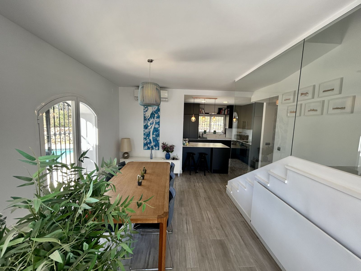Ontdek deze prachtige vrijstaande villa met volop privacy, gelegen in het hart van Elviria. Gelegen in een goed onderhouden, afgesloten wooncomplex met 19 villa's, midden in de natuur en op slechts 5 minuten rijden van zandstranden en voorzieningen. De renovatie in 2019 omvatte onder meer de ombouw van de begane grond en de garage tot een ruime speel- en familiekamer, die tevens als vijfde slaapkamer gebruikt kan worden. Deze gehele verdieping kan ook worden omgebouwd tot een apart appartement met één slaapkamer, een open woonkamer en keuken. Het appartement heeft veel natuurlijk licht dankzij een groot raam en twee dubbele glazen deuren naar buiten. U betreedt de woning via een eigen oprit met twee parkeerplaatsen. Via een paar trappen komt u binnen in de villa en bevindt u zich in het lichte, open ontwerp, waar de woonkamer, eetkamer en keuken moeiteloos in elkaar overlopen en alles binnen handbereik is. Vanuit de woonkamer met open haard heeft u toegang tot een zonnig terras met pergola, waar u kunt genieten van een prachtig uitzicht op zee en de omgeving. Vanuit de eetkamer en de volledig ingerichte moderne keuken heeft u toegang tot het privézwembad met een groot terras en een omheinde tuin. Deze gehele begane grond heeft een naadloze, praktische en functionele indeling, met twee slaapkamers en een badkamer met inloopdouche en vloerverwarming. De woon- en eetkamer, evenals de vier slaapkamers en de speelkamer, zijn voorzien van hoogwaardige infraroodstralers van Redwell, bekend om hun energiezuinigheid. Ze zijn onderhoudsvrij en voorzien van veiligheidsthermostaten om oververhitting te voorkomen. Op de bovenverdieping vindt u de hoofdslaapkamer met een grote badkamer met vloerverwarming en een terras met pergola vanwaar u een prachtig uitzicht op zee heeft. Zodra u afdaalt naar de kelder, vindt u nog een grote slaapkamer met toegang tot de tuin, een ruime badkamer met inloopdouche, de wasruimte en de ruime speelkamer met een grote dubbele schuifdeur met elektrische rolluiken en veel kastruimte. Zoals eerder vermeld, kan deze ruimte worden gebruikt als een vijfde slaapkamer of worden omgebouwd tot een gezellig appartement. De villa staat op een perceel van 568 m2 dat deel uitmaakt van de gemeenschap Acacias Park, maar is uitsluitend voor privégebruik bestemd. De tuinen worden onderhouden door uw eigen tuinman. Andere kenmerken van deze woning zijn: een afgesloten complex met moderne app-gestuurde toegang. Uitzicht op zee. Privézwembad met buitendouche, omheinde tuin, terrassen en barbecue. Infraroodstralers. Regenafvoeren. Zonnepanelen. Nieuwe airconditioningunits met filters. Vooraf geïnstalleerd alarmsysteem. Elektrische vloerverwarming in de twee hoofdbadkamers. Open haard in de woonkamer. Gedeeltelijk gemeubileerd. Daarnaast beschikt het complex over een groot gemeenschappelijk zwembad met clubhuis en barbecueplek en een tennisbaan. Mediterrane charme en een toplocatie zorgen voor zowel rust als gemak, waardoor dit een verborgen parel is in een van Marbella's meest gewilde en prestigieuze wijken. Binnen 5 minuten rijden vindt u bars, restaurants, cafés, winkels en faciliteiten voor comfortabel wonen. Er zijn golfbanen, beroemde tennis- en beachclubs en scholen op korte afstand: de internationale luchthaven van Málaga ligt op 30 minuten rijden. Het centrum van Marbella ligt op minder dan 10 minuten rijden.