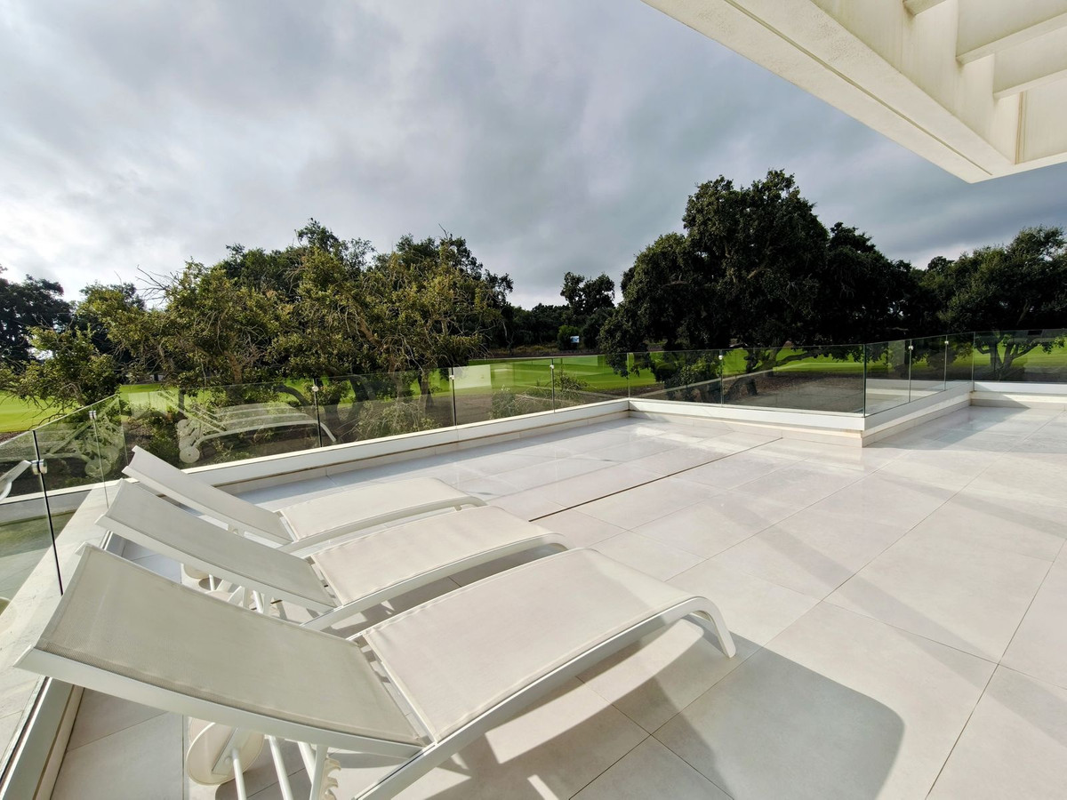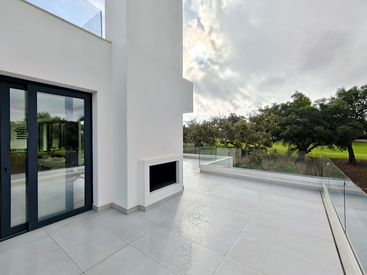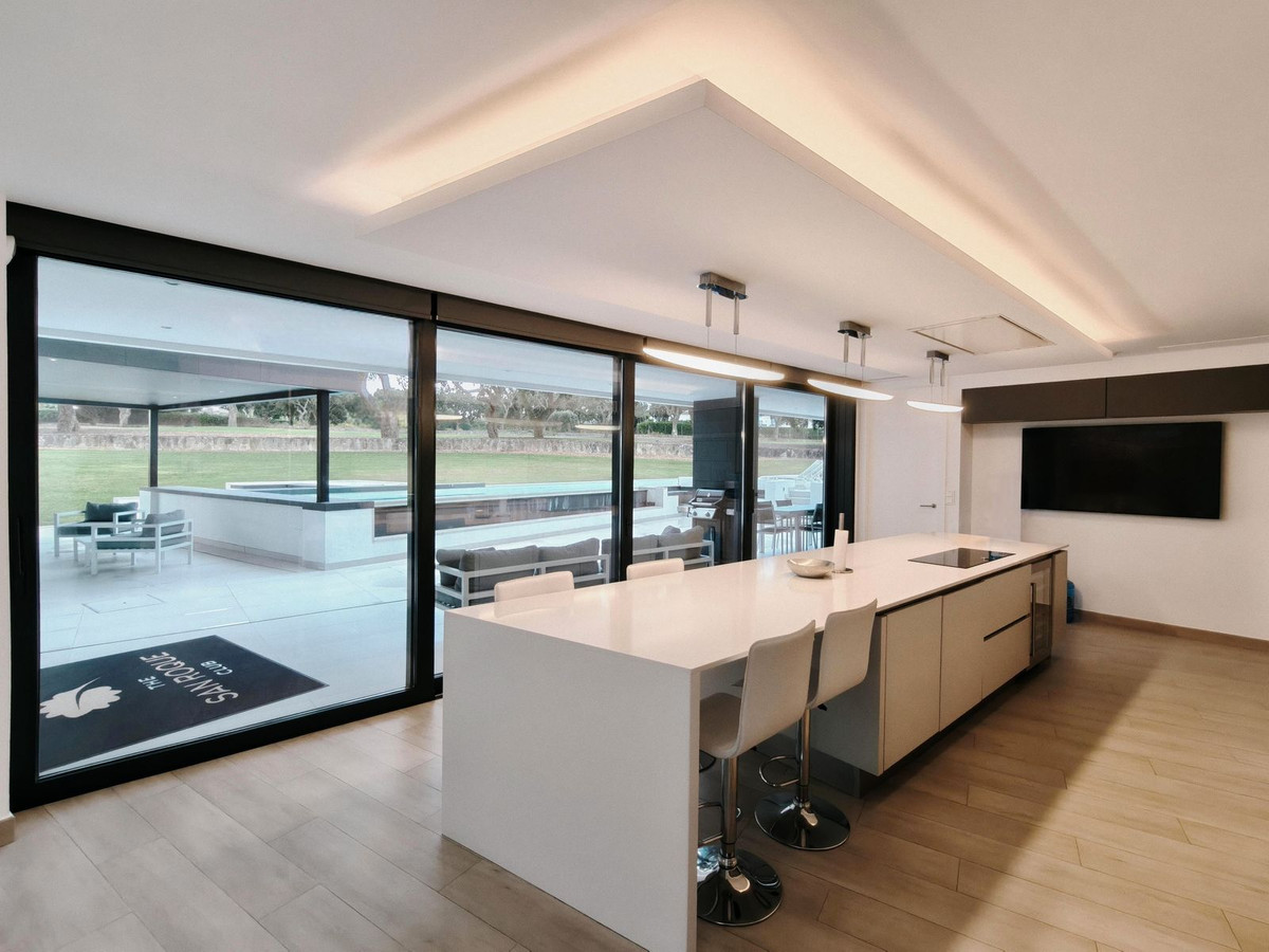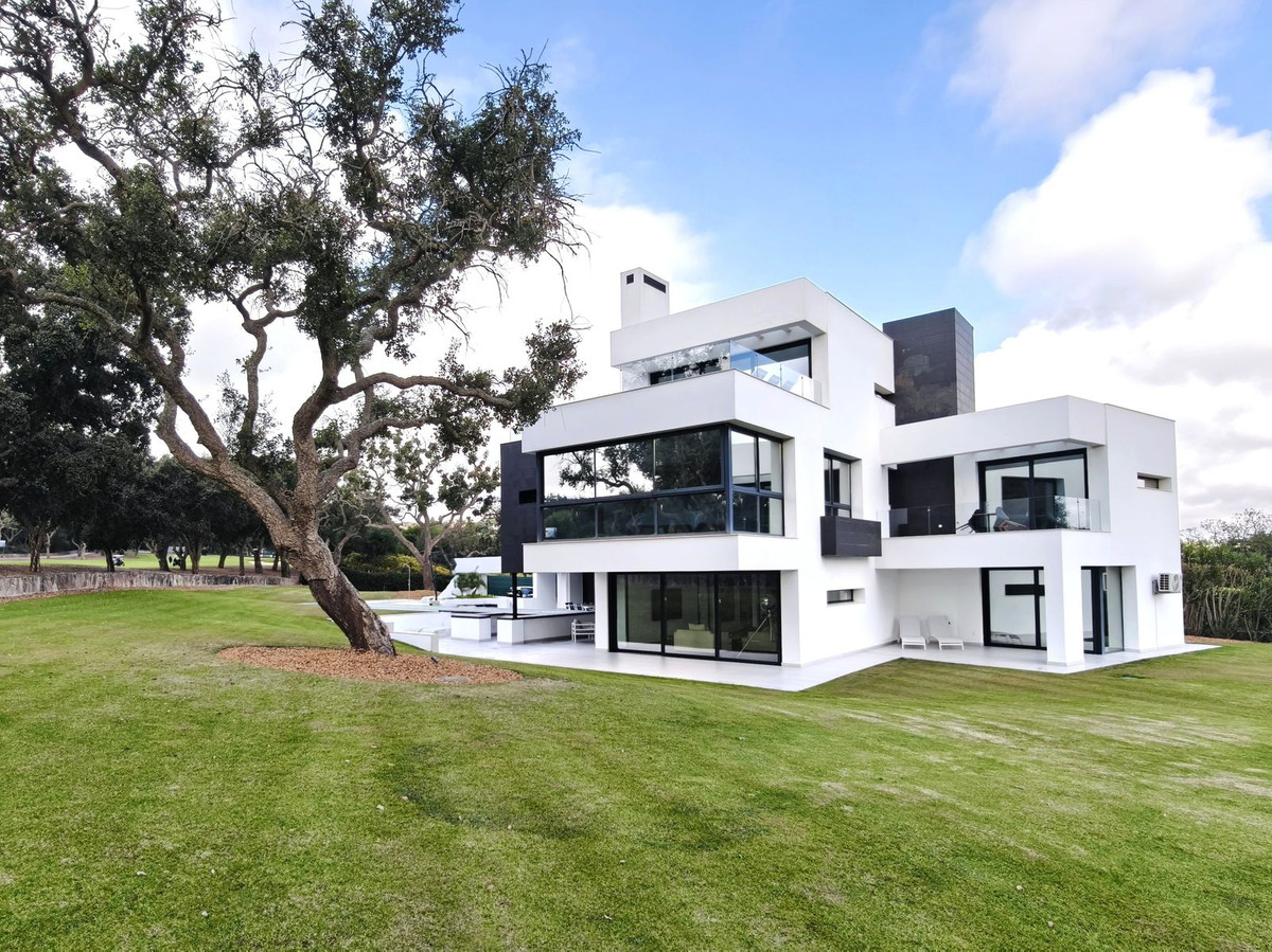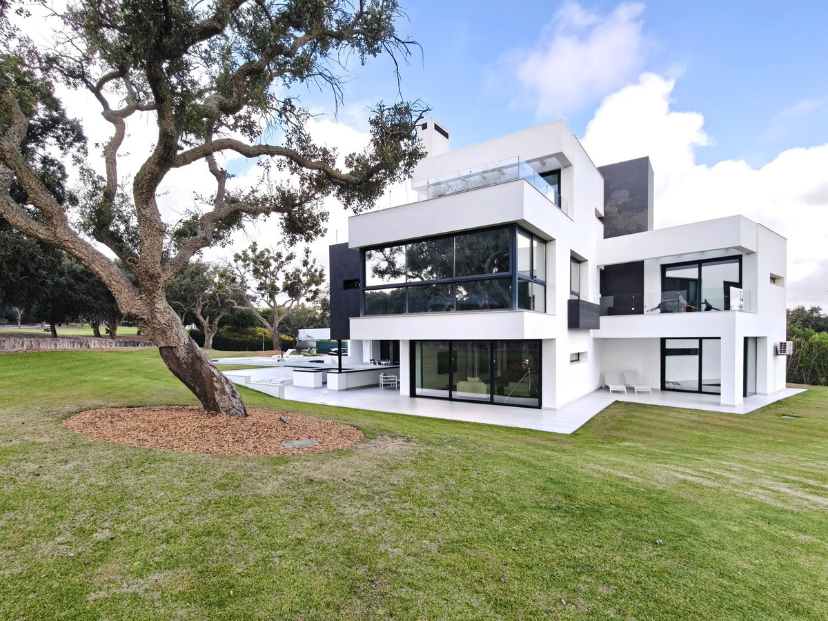Prachtige moderne villa met 5 slaapkamers in San Roque Club Deze uitzonderlijke moderne villa geniet een toplocatie met uitzicht op de prestigieuze golfbaan van San Roque. De villa beslaat drie verdiepingen plus een dakterras en combineert een geavanceerd design met luxe afwerkingen en adembenemende uitzichten. De woning beschikt over meerdere terrassen met panoramisch uitzicht op de golfbaan, een prachtig aangelegde tuin met een verwarmd privézwembad en een stijlvolle pergola met parkeergelegenheid voor twee auto's. Binnen vindt u de ruime master suite met een eigen loungehoek, een elegante badkamer met zowel een bad als een inloopdouche, en een kleedkamer. Grote ramen van vloer tot plafond overspoelen het interieur met natuurlijk licht, waardoor er een naadloze verbinding ontstaat tussen binnen- en buitenruimtes. Extra hoogtepunten zijn onder andere een volledig uitgeruste fitnessruimte op de bovenverdieping, open woon- en eetkamers en strakke, moderne afwerkingen door het hele appartement. Alle designmeubels en fitnessapparatuur zijn inbegrepen, wat een uitzonderlijke meerwaarde biedt en het appartement direct klaar maakt voor bewoning. Ideaal gelegen aan de Old Course tussen hole 1 en 18, biedt de villa een prachtig uitzicht op de golfbaan en zelfs een verre blik op zee vanaf het bovenste terras. Uitstekende mogelijkheden voor het genereren van inkomsten uit verhuur op korte termijn, waardoor het een uitstekende investeringsmogelijkheid is en tevens een luxe woning direct aan de golfbaan aan de Costa del Sol.
