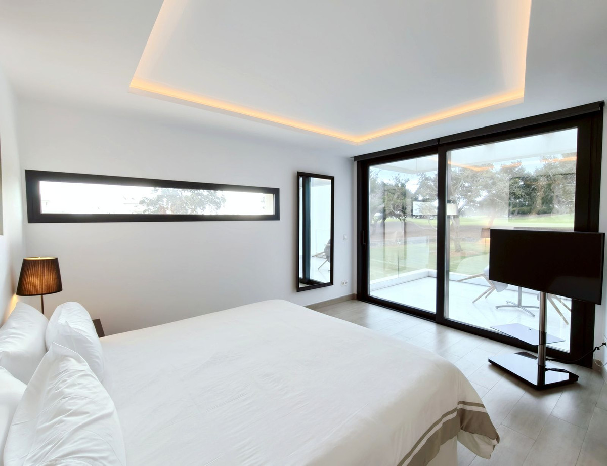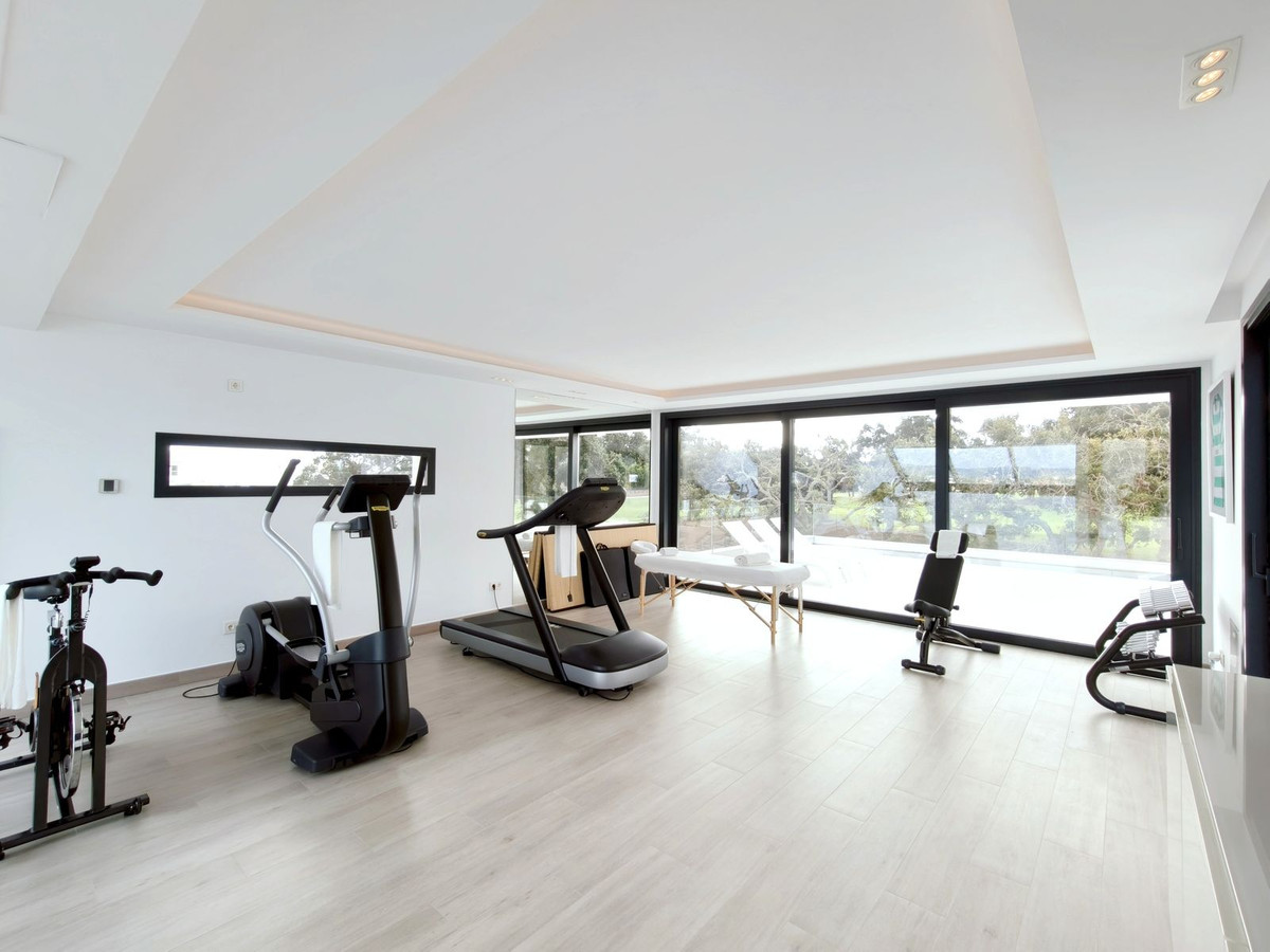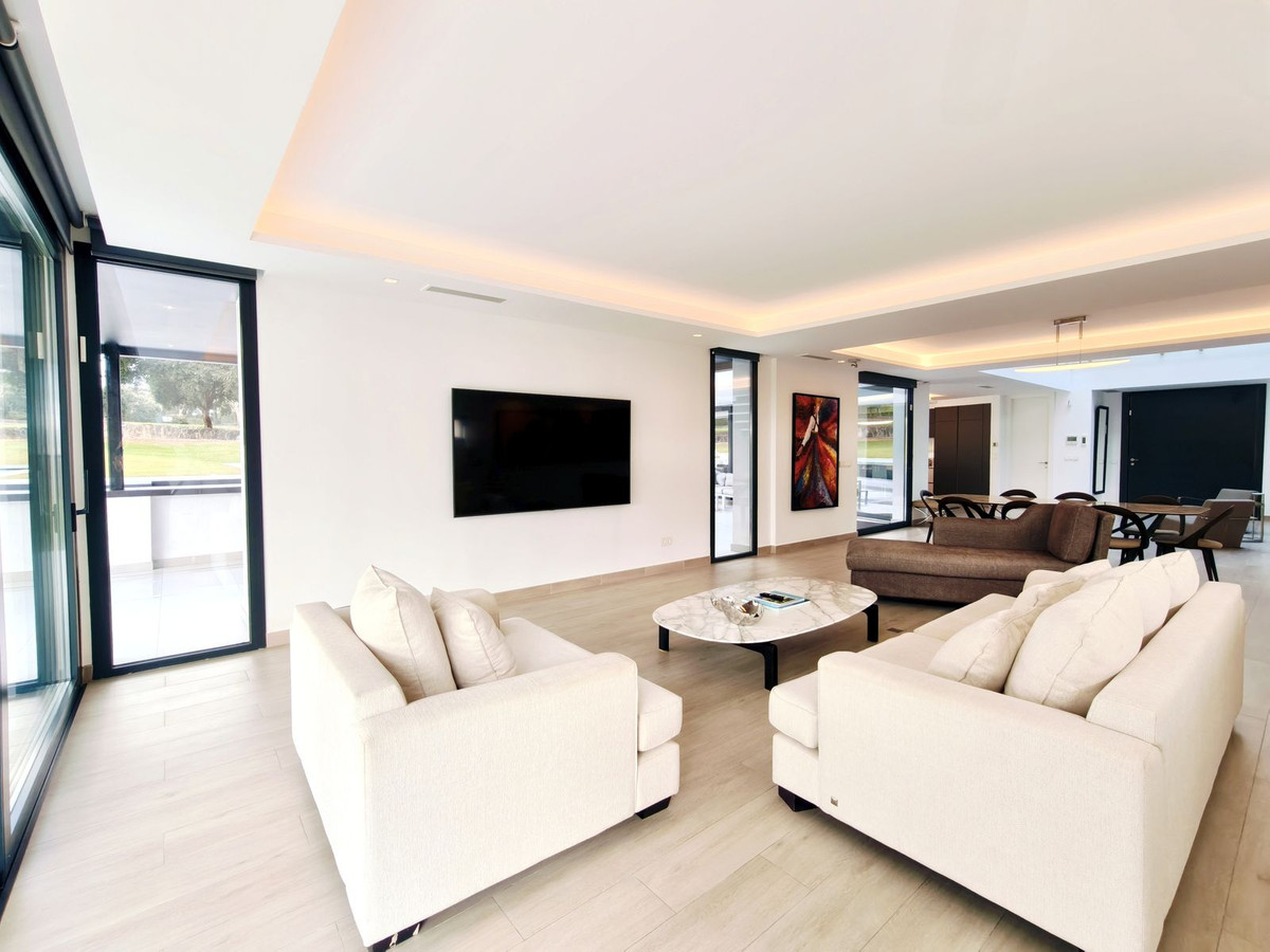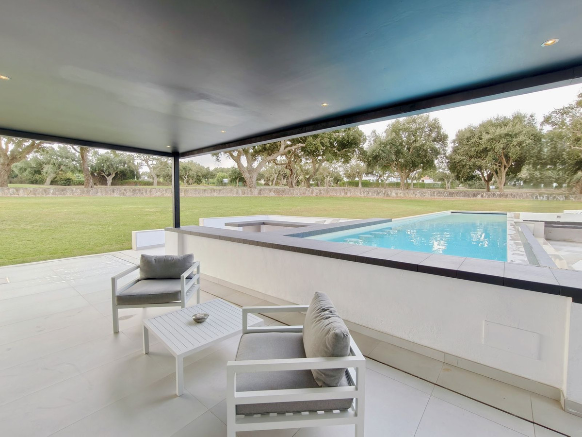 Prachtige moderne villa met 5 slaapkamers in San Roque Club Deze uitzonderlijke moderne villa geniet een toplocatie met uitzicht op de prestigieuze golfbaan van San Roque. De villa beslaat drie verdiepingen plus een dakterras en combineert een geavanceerd design met luxe afwerkingen en adembenemende uitzichten. De woning beschikt over meerdere terrassen met panoramisch uitzicht op de golfbaan, een prachtig aangelegde tuin met een verwarmd privézwembad en een stijlvolle pergola met parkeergelegenheid voor twee auto's. Binnen vindt u de ruime master suite met een eigen loungehoek, een elegante badkamer met zowel een bad als een inloopdouche, en een kleedkamer. Grote ramen van vloer tot plafond overspoelen het interieur met natuurlijk licht, waardoor er een naadloze verbinding ontstaat tussen binnen- en buitenruimtes. Extra hoogtepunten zijn onder andere een volledig uitgeruste fitnessruimte op de bovenverdieping, open woon- en eetkamers en strakke, moderne afwerkingen door het hele appartement. Alle designmeubels en fitnessapparatuur zijn inbegrepen, wat een uitzonderlijke meerwaarde biedt en het appartement direct klaar maakt voor bewoning. Ideaal gelegen aan de Old Course tussen hole 1 en 18, biedt de villa een prachtig uitzicht op de golfbaan en zelfs een verre blik op zee vanaf het bovenste terras. Uitstekende mogelijkheden voor het genereren van inkomsten uit verhuur op korte termijn, waardoor het een uitstekende investeringsmogelijkheid is en tevens een luxe woning direct aan de golfbaan aan de Costa del Sol.