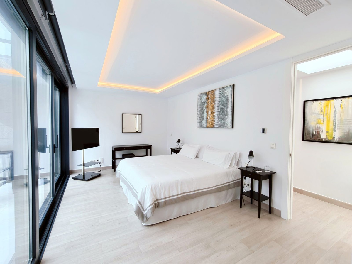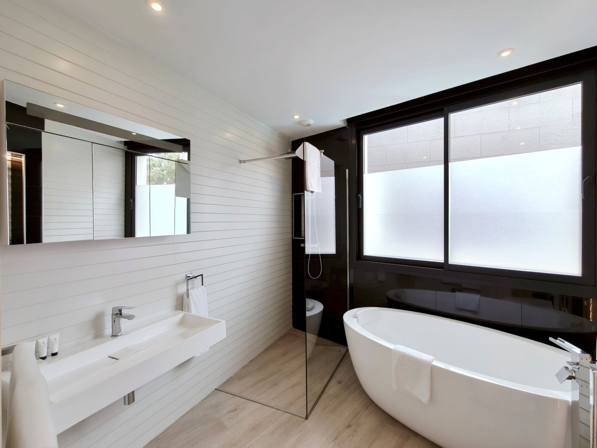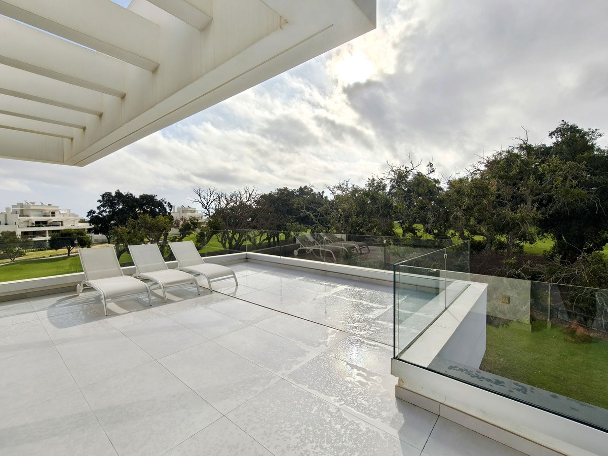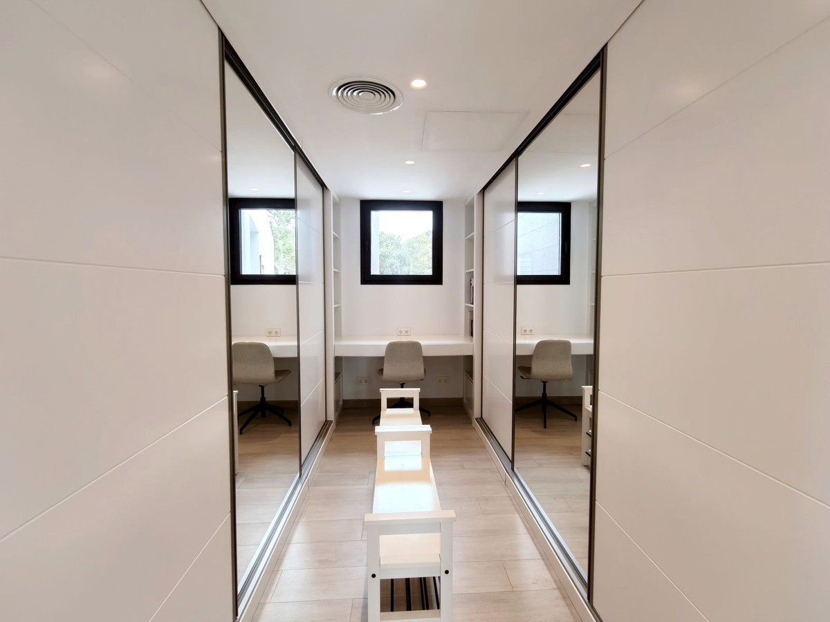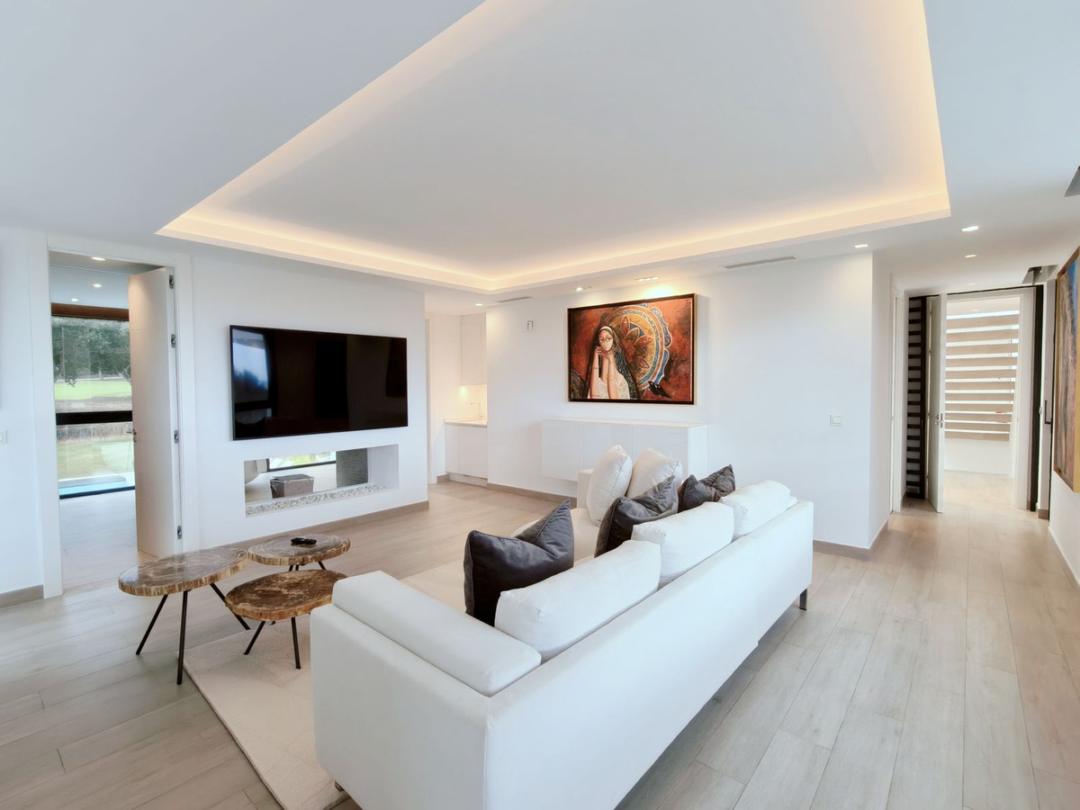 Prachtige moderne villa met 5 slaapkamers in San Roque Club Deze uitzonderlijke moderne villa geniet een toplocatie met uitzicht op de prestigieuze golfbaan van San Roque. De villa beslaat drie verdiepingen plus een dakterras en combineert een geavanceerd design met luxe afwerkingen en adembenemende uitzichten. De woning beschikt over meerdere terrassen met panoramisch uitzicht op de golfbaan, een prachtig aangelegde tuin met een verwarmd privézwembad en een stijlvolle pergola met parkeergelegenheid voor twee auto's. Binnen vindt u de ruime master suite met een eigen loungehoek, een elegante badkamer met zowel een bad als een inloopdouche, en een kleedkamer. Grote ramen van vloer tot plafond overspoelen het interieur met natuurlijk licht, waardoor er een naadloze verbinding ontstaat tussen binnen- en buitenruimtes. Extra hoogtepunten zijn onder andere een volledig uitgeruste fitnessruimte op de bovenverdieping, open woon- en eetkamers en strakke, moderne afwerkingen door het hele appartement. Alle designmeubels en fitnessapparatuur zijn inbegrepen, wat een uitzonderlijke meerwaarde biedt en het appartement direct klaar maakt voor bewoning. Ideaal gelegen aan de Old Course tussen hole 1 en 18, biedt de villa een prachtig uitzicht op de golfbaan en zelfs een verre blik op zee vanaf het bovenste terras. Uitstekende mogelijkheden voor het genereren van inkomsten uit verhuur op korte termijn, waardoor het een uitstekende investeringsmogelijkheid is en tevens een luxe woning direct aan de golfbaan aan de Costa del Sol.