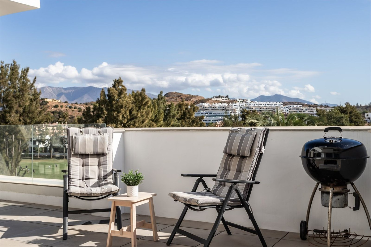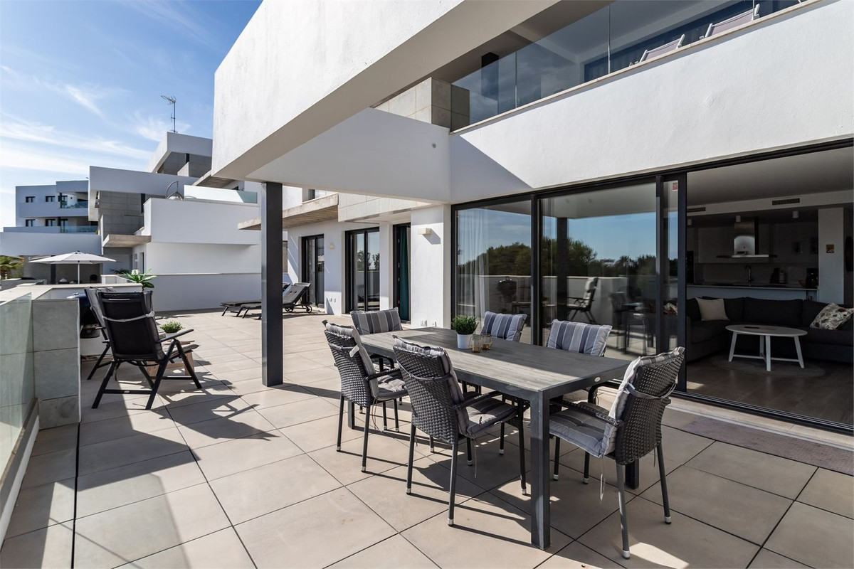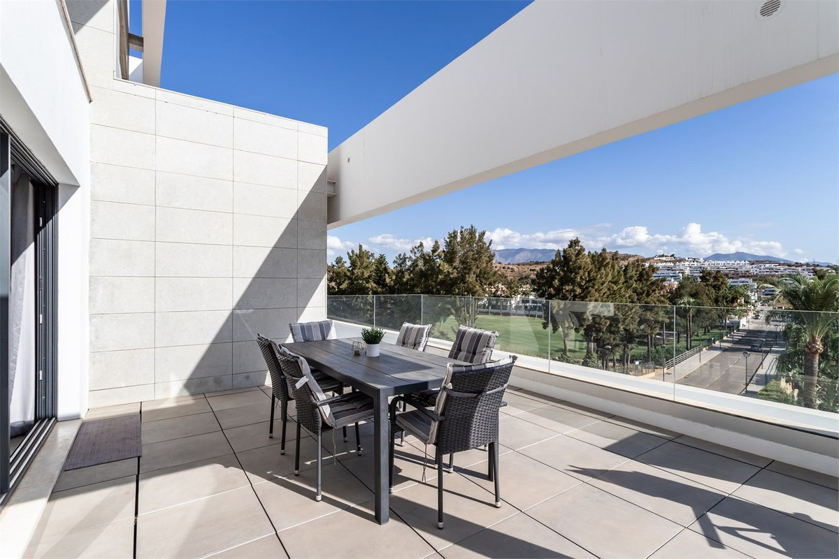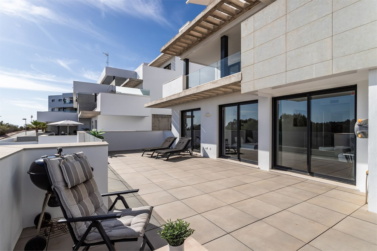 Dit moderne appartement heeft een goed ontworpen indeling met drie ruime slaapkamers, waarvan de hoofdslaapkamer een eigen badkamer ensuite heeft. Vanuit elke slaapkamer heeft u direct toegang tot het royale terras van 80 m², waar u kunt genieten van de ochtendzon en het rustgevende uitzicht op de golfbaan en het weelderige groen. Bij binnenkomst wordt u verwelkomd in een uitnodigende hal met gastentoilet. Extra comfort wordt geboden door vloerverwarming in de hele woning en ventilatie in beide badkamers. De woonkamer is open en uitnodigend en staat in directe verbinding met de grote keuken, voorzien van hoogwaardige BOSCH-apparatuur. Aansluitend aan de keuken bevindt zich een praktische bijkeuken met een wasmachine en de cv-installatie van het appartement. De totale woonoppervlakte bedraagt 138 m², waarvan 103 m² woonoppervlak. Het appartement beschikt tevens over een ruime garage en een berging. De community beschikt over drie gemeenschappelijke zwembaden, waarvan er één speciaal is ontworpen voor kinderen. De ligging is ideaal, op loopafstand van alle voorzieningen – supermarkten, winkels, restaurants – en ook de zee is op korte afstand.