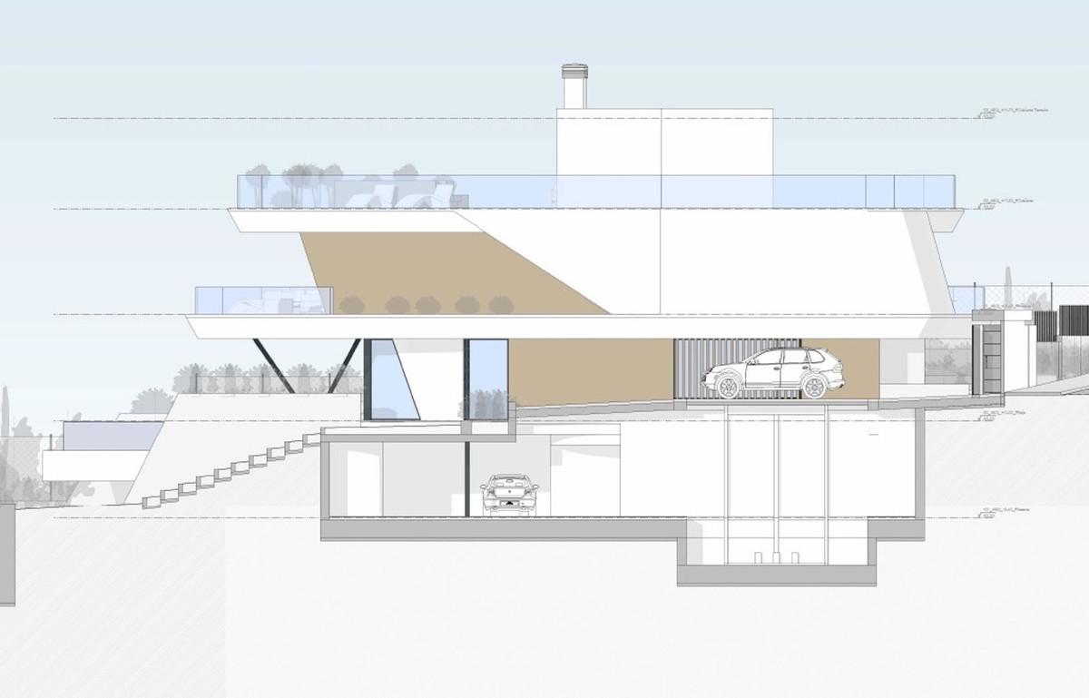 Het project betreft een moderne vrijstaande villa in mediterrane stijl, verdeeld over vier verdiepingen, aangepast aan de helling van het terrein. Het omvat een ondergrondse garage, een open woonkamer en keuken op de begane grond, drie slaapkamers op de eerste verdieping en een dakterras met jacuzzi. Het voldoet volledig aan de stedenbouwkundige voorschriften van PGOU Mijas, inclusief maximale bebouwbaarheid (0,50 m²/m²), hoogte, bewoning en een minimale terugbouw van 3,00 m.