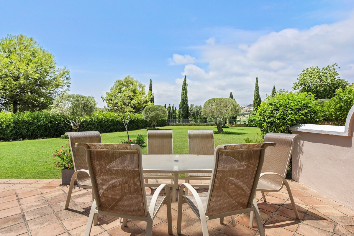 Een werkelijk bijzonder hoekappartement op de begane grond dat aanvoelt als een privé-finca dankzij de ruime terrassen die direct uitkomen op de weelderige tuinen, waardoor een uitzonderlijk gevoel van privacy, ruimte en verbondenheid met de natuur ontstaat. Binnen loopt de lichte, open woon- en eetkamer naadloos over in de buitenruimte en biedt zo de perfecte omgeving voor een mediterraan leven het hele jaar door. De woning beschikt over een royale master suite met een elegante en-suite badkamer met dubbele wastafels, een ligbad en een inloopdouche, een volledig uitgeruste keuken en een gastentoilet. Zowel de woonkamer als de slaapkamer geven direct toegang tot het terras en de tuin. Gelegen in El Lago de Los Flamingos, een intiem en exclusief complex met slechts 32 luxe appartementen direct aan de golfbaan, onderscheidt dit pand zich door tijdloze kwaliteit en vakmanschap. Het complex kijkt uit over de 3e hole van de Los Flamingos golfbaan en is omgeven door Toscaanse tuinen met eikenbomen, cipressen, kleurrijke bloemen en een sereen uitzicht op het meer en de golfbaan. El Lago is ontworpen met alleen de beste materialen en biedt een niveau van elegantie en bouwkwaliteit dat tegenwoordig zelden wordt aangetroffen. Op loopafstand van het iconische 6-sterren Villa Padierna Palace Hotel en gelegen in een rustige doodlopende straat, is het een oase van rust en verfijning. Dit appartement wordt volledig gemeubileerd verkocht en is inclusief een ondergrondse parkeerplaats en berging. Het combineert op perfecte wijze klassieke elegantie, superieur comfort en de essentie van het verfijnde leven in Marbella.
