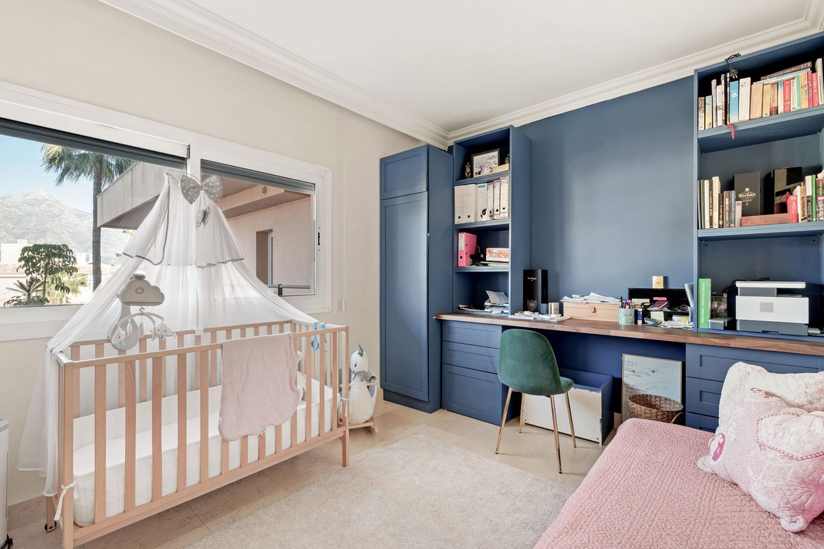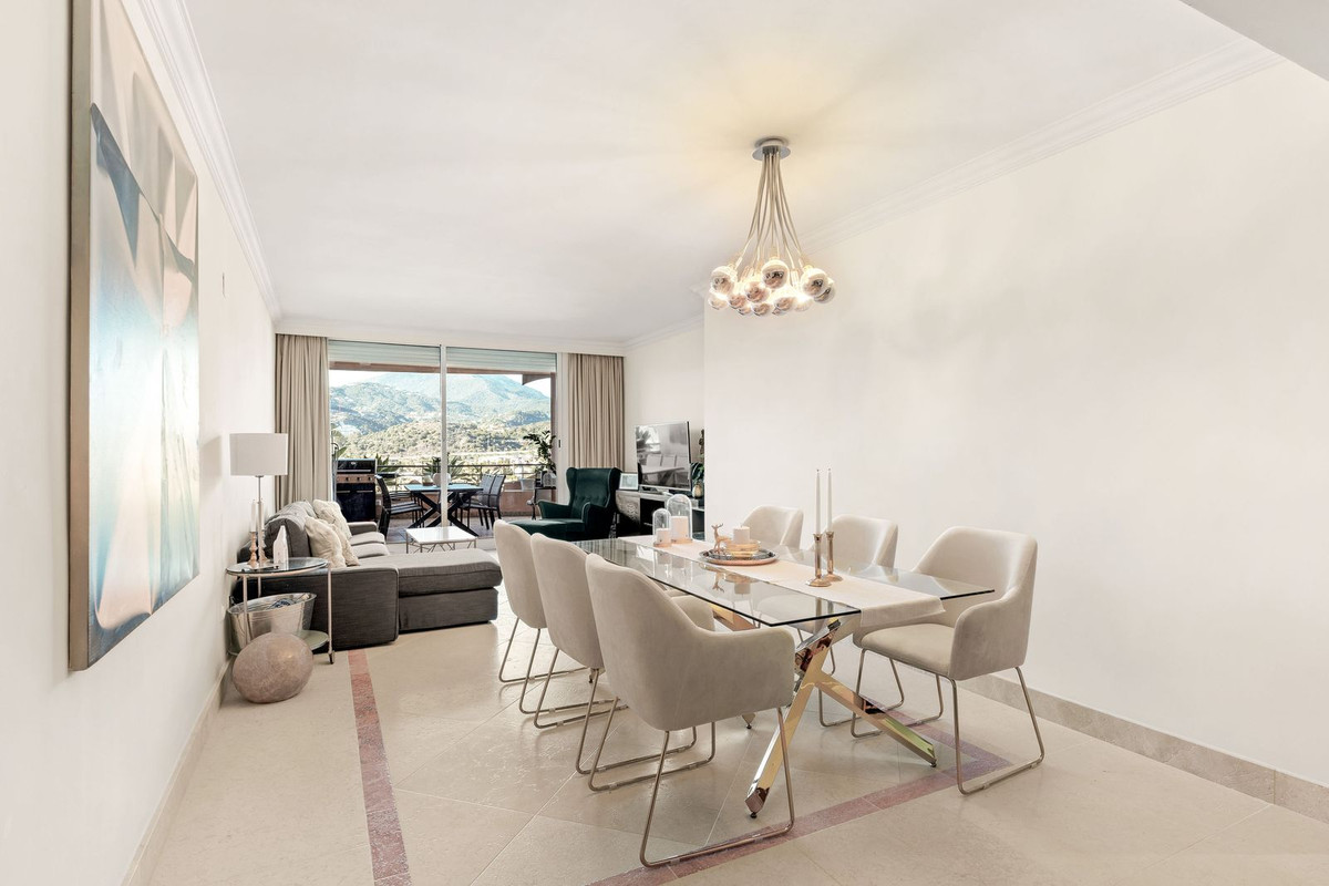 Dit prachtige appartement op de eerste verdieping ligt in de karakteristieke wijk Magna Marbella en biedt een panoramisch uitzicht op Naranjos Golf en de bergen daarachter. Magna Marbella is perfect gelegen in Nueva Andalucia op een van de belangrijkste bergkammen van de golfvallei en biedt uitzichten die maar zelden te vinden zijn in dit gewilde gebied. De gemeenschap beschikt over weelderige, volgroeide tuinen en prachtig onderhouden gemeenschappelijke zwembaden, evenals 24-uurs beveiliging. Dit alles ligt op korte afstand van de voorzieningen en golfbanen van The Golf Valley. Het appartement zelf ziet er goed uit en beschikt over een moderne en volledig ingerichte keuken met Bosch- en Miele-apparatuur. Verderop bevinden zich een gastentoilet en de eetkamer die doorloopt in de woonkamer, alle met een prachtig open uitzicht. De woning beschikt over een ruim hoofdterras, dat toegankelijk is vanuit de woonkamer en ideaal is voor buitenactiviteiten en ontspanning. Van daaruit bereiken we de slaapkamers met de logeerkamer, momenteel in gebruik als kinderkamer/kantoor, met een prachtige accentmuur en een gastenbadkamer met ligbad en een gastenbadkamer met ligbad. De hoofdslaapkamer beschikt over een eigen badkamer met inloopdouche en jacuzzi. Vanuit de slaapkamer heeft u toegang tot het balkon met uitzicht op La Concha en tot het hoofdterras. Airconditioning (warm/koud) en vloerverwarming in het hele huis. Bij het pand is een ruime ondergrondse parkeerplaats en berging inbegrepen in de prijs.
