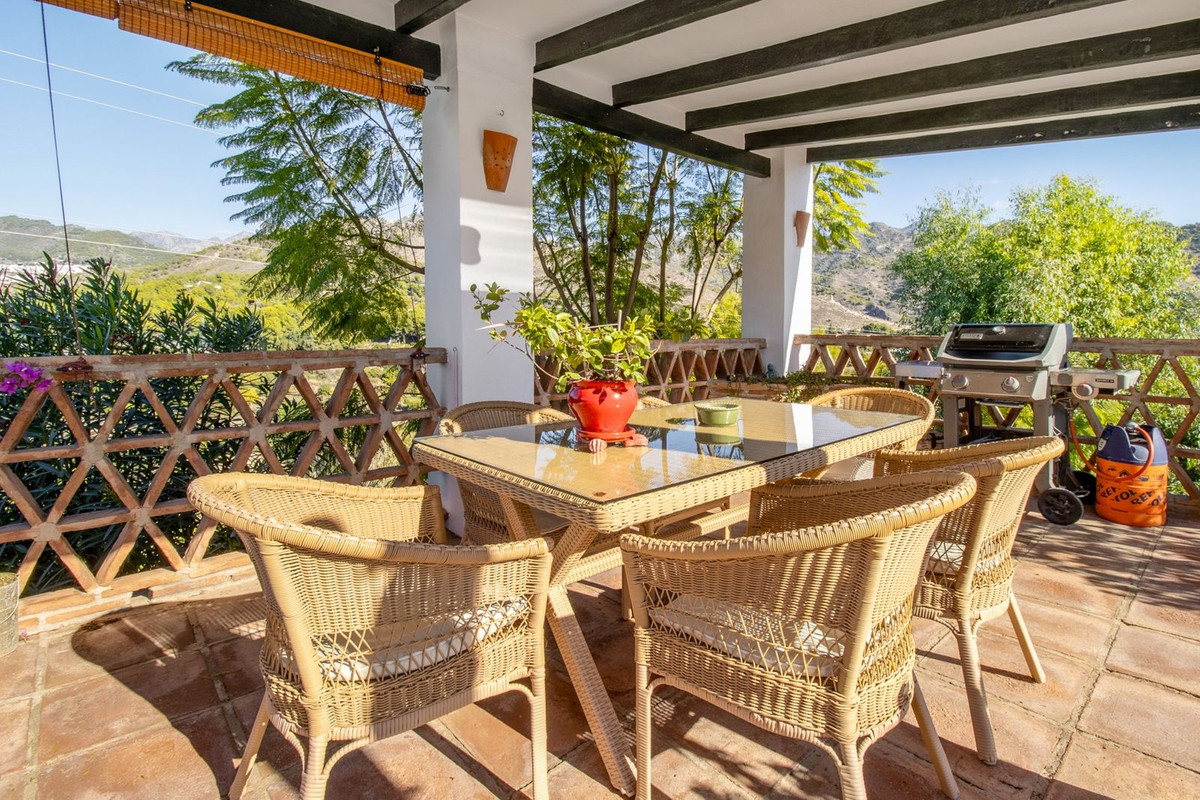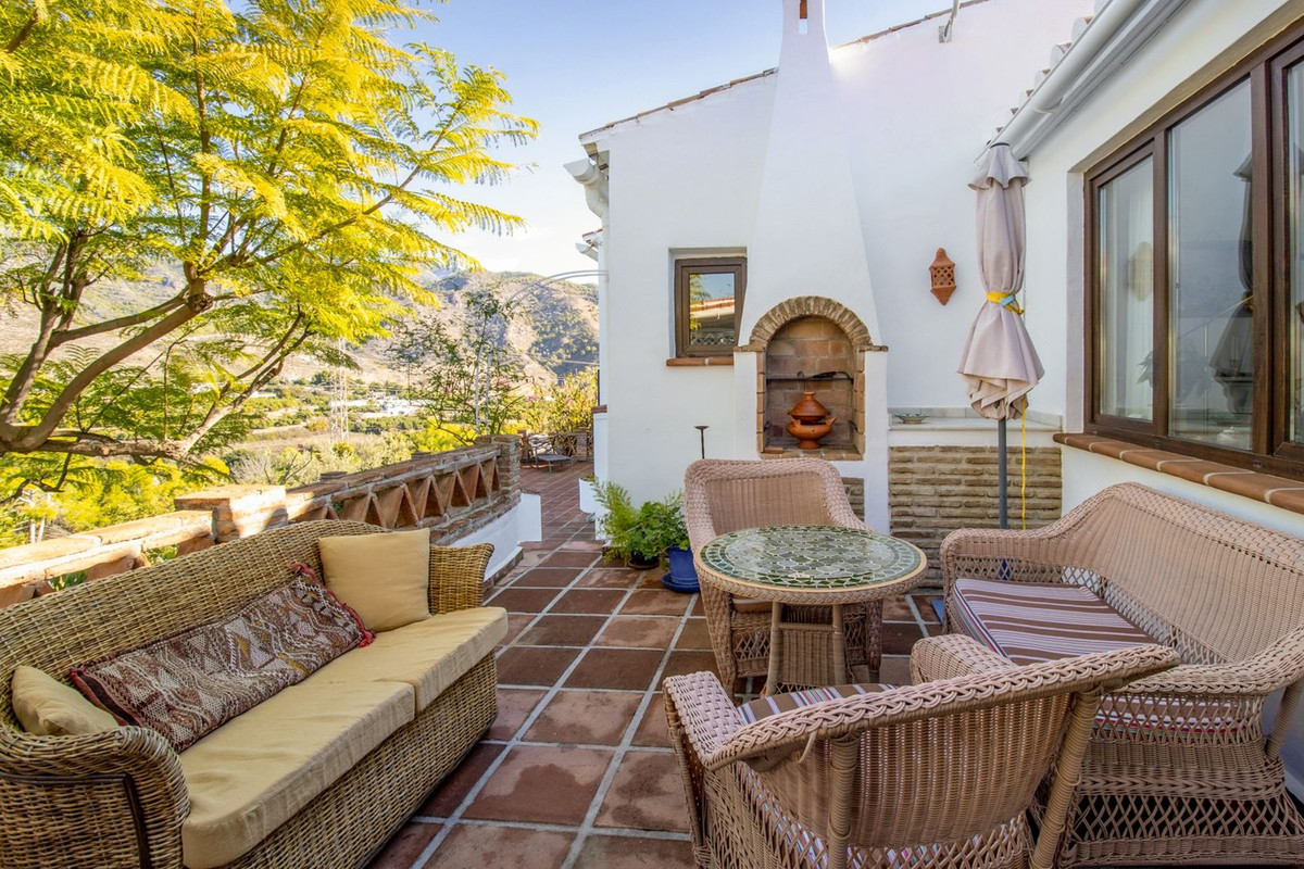 In de gewilde wijk Tablazos, tussen Frigiliana en Nerja, vindt u deze gezellige en charmante villa die comfort en karakter combineert. Het huis beschikt over vier slaapkamers en drie badkamers, een sfeervolle woonkamer en een prachtig gerenoveerde keuken die uitnodigt tot zowel dagelijks leven als gezellige bijeenkomsten. Dankzij zes airco-units is het binnenklimaat altijd aangenaam en met de recent geïnstalleerde 14 zonnepanelen blijft het elektriciteitsverbruik het hele jaar door laag. Het huis heeft tevens drie open haarden die niet alleen warmte bieden, maar ook een knusse sfeer creëren. De buitenruimtes zijn al even aantrekkelijk. Rondom het huis bevinden zich diverse mooie terrassen, sommige met een prachtig uitzicht op de bergen, en vanaf het bovenste terras is zelfs een glimp van de zee te zien. Het privézwembad vormt op zonnige dagen vanzelfsprekend het hart van het huis, en de goed onderhouden tuin met fruitbomen zorgt voor een weelderige en uitnodigende sfeer. Vanaf het kleine dakterras kunt u de glinstering van de Middellandse Zee bewonderen, maar de majestueuze bergen zijn minstens zo prachtig om te zien. Voor wie praktische ruimtes op prijs stelt, is er een ruime dubbele garage van 54 m², voldoende parkeergelegenheid buiten en een berging of hobbyruimte van circa 10 m² met een raam en natuurlijk licht. De locatie is ideaal voor wie dicht bij alle voorzieningen wil wonen, maar toch van rust en stilte wil genieten. Nerja ligt op slechts 3 km afstand en is met de auto in ongeveer 5 minuten te bereiken. Het charmante Frigiliana ligt op slechts 6 km afstand. Dankzij de gunstige snelwegverbinding is de luchthaven van Málaga in circa 45 minuten te bereiken – perfect voor zowel inwoners als bezoekers. De eigenaren vertellen hoe het is om in dit fantastische huis te wonen: "Wonen in Casa La Parra in Tablazos betekent voor ons dat we 'een stukje paradijs' hebben gevonden, precies zoals de vorige eigenaar het beschreef toen we hier acht jaar geleden kwamen wonen. Thuiskomen in ons mooie en rustige huis voelt extra fijn na een paar uur in het charmante en levendige stadje Nerja, met zijn vele restaurants en winkels die het hele jaar open zijn, of na een bezoek aan een van de vele prachtige stranden." We hebben eveneens genoten van de fantastische wandelroutes die direct bij het huis beginnen. Een klein pad vanaf het terrein leidt ons naar de Rio Higuerón en verder langs de rivier naar Nerja, een wandeling van een half uur, of stroomopwaarts langs de rivier naar het adembenemend mooie dorp Frigiliana. Wat we ook geweldig vonden, was de mogelijkheid om de prachtig aangelegde terrastuin in te lopen en diverse vruchten rechtstreeks van de bomen te plukken. Je vindt er bijna het hele jaar door avocado's, olijven, citroenen, mandarijnen, clementines, druiven, bananen, nísperos, kaki, cherimoya, drie soorten vijgen, granaatappels, amandelen, eucalyptus en mango's. Ook de bloemenpracht is hier prachtig wanneer de verschillende kleuren bougainvillea, rozen, oleander en hibiscus in bloei staan. Nog een positief punt is dat je in Casa La Parra de allerbeste buren hebt die je je maar kunt voorstellen. Dit is een woning die levenskwaliteit en functionaliteit op de best mogelijke manier combineert – een ideale residentie voor iedereen die op zoek is naar een rustig leven aan de Costa del Sol, maar toch dicht bij de charme van Frigiliana en de stranden van de Middellandse Zee wil wonen.