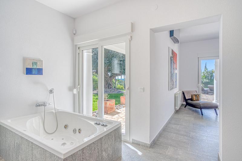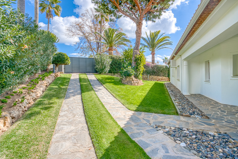 Ontdek deze exclusieve gelijkvloerse villa in Hacienda Las Chapas, een van de meest prestigieuze woonwijken van Marbella. De villa ligt in een rustige, luxe buurt met 24-uursbeveiliging, op slechts enkele minuten van gerenommeerde internationale scholen, golfbanen, winkels, restaurants en het strand. De hoofdwoning is doordacht ingedeeld op één verdieping en beschikt over drie ruime slaapkamers, elk met een eigen en-suite badkamer, plus een gastentoilet voor extra gemak. De master suite omvat een inloopkast en directe toegang tot de weelderige tuin, wat zorgt voor een rustige en privé-oase. Op de benedenverdieping bevindt zich een zelfstandig studioappartement, ideaal voor gasten, personeel of verhuur. Daarnaast is er een grote multifunctionele ruimte met een gastentoilet, die naar wens kan worden ingericht als fitnessruimte, speelkamer, thuiskantoor of wat u maar wilt. Buiten vindt u een prachtig aangelegde, volgroeide tuin, met in het midden een majestueuze olijfboom en een indrukwekkend verwarmd zwembad. De villa biedt een vrij uitzicht op de zee en de bergen, volledige privacy en een ligging op het zuiden die zorgt voor overvloedig natuurlijk licht gedurende de hele dag. Het ruime terras is ideaal om buiten te dineren en gasten te ontvangen. Binnen vormt de lichte, open keuken, woon- en eetkamer het hart van de woning. Deze ruimte is ontworpen voor zowel comfort als functionaliteit, en beschikt over een gezellige open haard en directe toegang tot het terras, perfect voor gezellige familieavonden of elegante bijeenkomsten. Extra functies zijn onder andere: Airconditioning in alle slaapkamers Dubbelglas ramen Alarmsysteem Keramische vloeren Automatisch irrigatiesysteem Prachtige tuinverlichting 's nachts Brede oprit Dubbele carport Aparte wasruimte met directe toegang tot de dubbele garage. Deze villa is een zeldzaam juweel en biedt karakter, privacy en potentie op een van de meest gewilde locaties van Marbella – een ideale permanente woning of luxe vakantiewoning.
